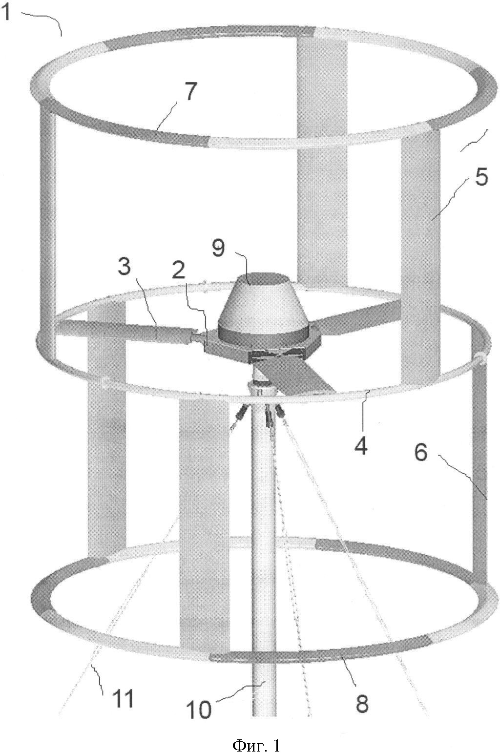 Подробно опишем вариант конструкции, представленный на фиг.1. Ротор 1 имеет ступицу 2, в которой скомпонован электрогенератор, закрытый кожухом 9. От ступицы 2 радиально идут силовые траверсы, закрытые аэродинамическими обтекателями 3, которые служат и в качестве аэродинамических тормозов. Силовое кольцо 4 крепится к концам траверс, а к нему вверх и вниз монтируются лопасти 5 и 6. Лопасти 5 соединяются вверху кольцом 7, а лопасти 6 соединяются внизу кольцом 8. Ступица 2 монтируется на мачту 10, которая удерживается растяжками 11. На фиг.2 представлена форма профиля, соответствующая приведенной в таблице 1. На фиг.3 показано, как задается установочный угол лопасти. На фиг.4 показано сечение верхнего кольца (или нижнего). Для ликвидации вихреобразования высота «h» в отношении ширины «d» составляет от 0.5 до 0.65.