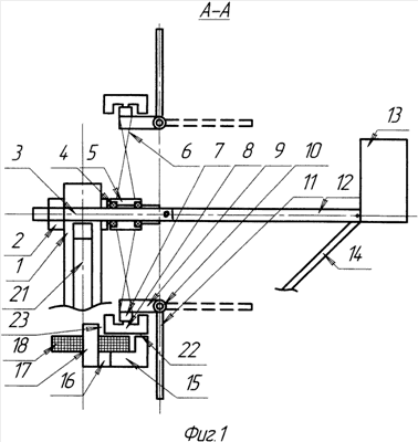Ветроэлектрогенератор содержит вращающуюся стойку – оголовок 1, на которой с помощью гаек 2 закреплен центральный стержень 3, на котором в подшипниках установлена втулка 5 ветроколеса, на которой, в свою очередь, с помощью спиц 6 укреплены обод 7 с роторными элементами 8 и кронштейном 9, несущие упругие шарниры 10 с лопастями 11. Центральный стержень снабжен планкой 12. Несущий хвостовой элемент 13 связан с подкосом 14. Статор включает в себя однотипные элементы сегментного типа, каждый из которых содержит Г-образный магнитопровод 15, постоянный магнит 16, стержневой пакет 17, катушку 18. Все элементы укреплены на двух крепежных секциях 19 и 20, расположенных симметрично по правую и левую сторону от стойки – оголовка 1, которая вращается в подшипнике, установленном в верхней части мачты 21. Как видно из фиг.1, роторный элемент 8 имеет Ш – образную форму, при этом Г-образный магнитопровод 15 статора имеет воздушный зазор 22 с горизонтальным участком роторного элемента, а стержневой пакет 17 магнитопровода статора имеет воздушный зазор 23 с вертикальным (левым на фиг.1) участком Ш-образного роторного элемента 8. Центральный стержень 3, являющийся осью ветроколеса, имеет соединение с планкой 12, играющей роль, наряду с подкосом 14, крепления хвостового элемента 13. Подкос 14 своим нижним концом установлен на стойке 1 (на фиг.1 не показано из-за отсутствия места).