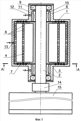 Размещение во внутренней полости цилиндрического ротора, как минимум, одной соосной цилиндрической поверхности меньшего диаметра, а также размещение равномерно по окружности, как минимум, двух радиально расположенных перегородок, примыкающих к цилиндрической и торцевой поверхностям внутренней полости ротора, обусловлено следующими факторами: