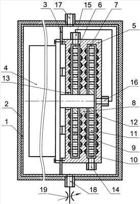 Проточный нагреватель роторного типа состоит из герметичной емкости 1, заармированной теплоизолирующим нетокопроводящим материалом 2, внутри которой на кронштейнах 3 жестко закреплен погружной электродвигатель 4 с корпусом 5. В цилиндрических полостях 6, 7 корпуса 5, разделенных перегородкой 8, на вале погружного электродвигателя 4 закреплены соответственно диски 9, 10, на которых выполнены радиальные ряды сквозных отверстий 11. На торцевых стенках цилиндрических полостей 6, 7 обеих сторонах перегородки 8 выполнены аналогичные ряды глухих отверстий 12. По центру цилиндрической полости 6 в стенке корпуса 5 размещен входной канал 13, выполненный в виде зазора между отверстием в торцевой стенке корпуса 5 и валом погружного электродвигателя 4. Выходной канал 14 выполнен в стенке корпуса 5 на периферии цилиндрической полости 7. Полости 6 и 7 соединены между собой перепускным каналом, отверстие 15 которого выполнено в стенке корпуса 5 на периферии цилиндрической полости 6, а отверстие 16 выполнено в стенке корпуса по центру цилиндрической полости 7. Входной 17 и выходной 18 патрубки герметичной емкости 1 размещены на ее противоположных стенках напротив друг друга. Непосредственно после выходного патрубка 18 установлен регулируемый дроссель 19.