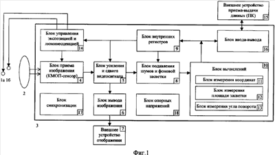 Изображение расположенных вне устройства источников света 1а и 1б через линзу (или диафрагму) 2 проецируется на фоточувствительную плоскость КМОП-сенсора блока приема изображения 4. Сигнал сенсора, содержащий видеокартинку захватываемого изображения, поступает в блок усиления и сдвига видеосигнала 5. Калиброванный видеосигнал через блок вывода изображения 6 может быть выведен на внешнее устройство отображения 7 для визуального контроля в режиме реального времени. Также видеосигнал проходит через блок подавления шумов и фоновой засветки 8, где сравнивается с пороговыми значениями сигналов, которые задаются (пользователем или заводом-изготовителем) в блоке внутренних регистров 9. Калиброванный и свободный от шумов сигнал поступает в блок вычислений 10. Блок вычислений 10 состоит из трех блоков: блока измерения двумерных координат 11, блока измерения площади засветки от источников света 12 и блока измерения угла поворота одного источника света вокруг другого 13. Результаты вычислений сохраняются в блоке внутренних регистров 9. Одновременно блок внутренних регистров 9 задает режим работы блока управления экспозицией и длительностью времени люминесценции 14. Увеличивая время экспозиции и время люминесценции внешних источников света 1а и 1б, блок управления экспозицией и длительностью времени люминесценции 14 позволяет увеличить амплитуду информационного сигнала по отношению к шумам, например, в условиях плохой видимости (увеличение запыленности среды и т.п.). Запись значений регистров блока внутренних регистров 9 и считывание результатов измерений осуществляется внешним устройством приема-выдачи данных 15 (например, ПК) через блок ввода-вывода 16, который представляет собой цифровой интерфейс связи. Блок синхронизации 17 обеспечивает синхронное взаимодействие всех внутренних блоков устройства 3 и попеременное включение внешних источников света 1а и 1б (в соответствии с кадровой синхронизацией КМОП-сенсора) в режиме работы устройства 3 с двумя источниками света. При режиме работы устройства 3 с одним источником света (задается блоком внутренних регистров 9) блок синхронизации 17 обеспечивает включение только одного источника света, при этом блок вычисления угла поворота 13 отключается. Блок опорных напряжений 18 задает требуемые напряжения питания микросхемы и опорные напряжения внутренних схем всех блоков устройства 3.