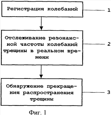 Ниже со ссылкой на фиг.1 описывается способ обнаружения прекращения распространения заполненной жидкостью трещины в среде. На этапе 1 регистрируют колебания заполненной жидкостью трещины, при этом, предпочтительно, перед регистрацией колебания заполненной жидкостью трещины возбуждают. Регистрацию и возбуждение колебаний трещины выполняют с помощью любого известного подходящего способа или средства, описанного выше.