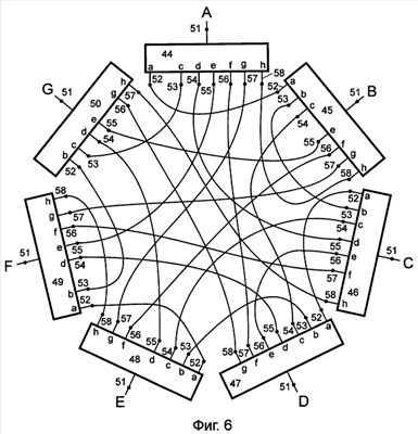 В седьмом логическом блоке 50 первый 122 и второй 123 демультиплексированные входы-выходы второго волнового фильтра 60 соединены соответственно с мультиплексированным входом-выходом 124 четвертого волнового фильтра 62 и с пятым входом-выходом 55 седьмого логического блока 50, первый 125 и второй 126 демультиплексированные входы-выходы третьего волнового фильтра 61 соединены соответственно с мультиплексированным входом-выходом 127 пятого волнового фильтра 63 и со вторым входом-выходом 52 седьмого логического блока 50, первый 128 и второй 129 демультиплексированные входы-выходы четвертого волнового фильтра 62 соединены соответственно с седьмым 57 и шестым 56 входами-выходами седьмого логического блока 50, первый 130 и второй 131 демультиплексированные входы-выходы пятого волнового фильтра 63 соединены соответственно с четвертым 54 и третьим 53 входами-выходами седьмого логического блока 50.