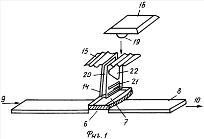 6. При дальнейшем движении П-образного выступа щелевой световод пересекают большое окно 20 и малое окно 22, давая на выходе сигнал 1 (участок 23 фиг.8).