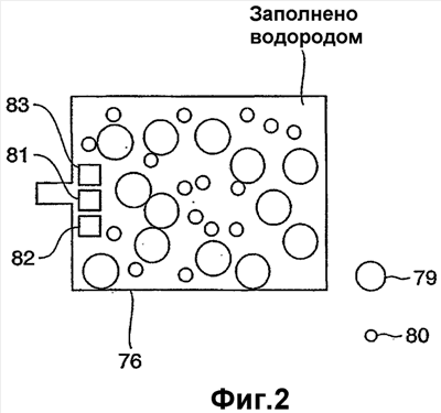 Фиг.2 показывает подробную структуру топливного резервуара 76. Топливный резервуар 76 содержит первый сплав 79 для хранения водорода, второй сплав 80 для хранения водорода, датчик 81 давления, выходную цепь 82 и датчик 83 температуры. Внутренняя часть топливного резервуара 76 заполнена водородом, выделяющимся из сплавов для хранения водорода.