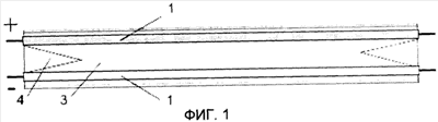 Согласно первого варианта исполнения токопроводящий кабель (фиг.1) содержит две изолированные друг от друга токопроводящие жилы 1, помещенные в изоляционную оболочку 2, и концы которых присоединены к контактным узлам (не показаны). Для обеспечения регулирования по параметру межпроводниковой емкости изоляционная оболочка представляет собой ленту 3, по краям которой закреплены токопроводящие жилы, расположенные на ленте на участке между контактными узлами на расстоянии друг от друга не менее 4 см, при этом указанная лента выполнена с возможностью соединения ее краев между собой по крайней мере на части ее длины для сближения токопроводящих жил (фиг.2). На концевых участках лента выполняется с вырезом 4 между токопроводящими жилами для обеспечения возможности сближения свободных концов токопроводящих жил и их соединения с контактным узлом. Возможность соединения краев ленты между собой (как это показано на фиг.2) по крайней мере на части ее длины для сближения токопроводящих жил обеспечивается тем, что края ленты выполняются как элементы замка Zip-Lock 5, используемого широко для упаковочных полиэтиленовых пакетов, либо застежки-молнии или скользящей застежки. Таким образом, для изменения характеристик кабеля по параметру межпроводниковой емкости необходимо соединить между собой края ленты и перемещением застежки молнии добиться требуемого параметра.
