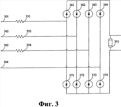 Компонент 423 сопротивления формирует сопротивление последовательно каждому входу фазы для ограничения бросков напряжения, вызванных переходными процессами. Элемент сопротивления также может быть подключен последовательно входу нейтральной точки для обеспечения дополнительного ослабления энергии переходных процессов. Может использоваться любой способ, любая система или технология, известные в технике для создания сопротивления в цепи, в частности резистор. Иллюстративный вариант компонента 423 сопротивления показан на фигуре 3, в форме резисторов 331-333.