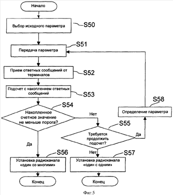 [94] Универсальная наземная сеть радиодоступа “UTRAN” подсчитывает с накоплением количество принятых ответных сообщений и сравнивает накопленное количество ответных сообщений с пороговым значением (операции S43 и S44). Если накопленное счетное значение больше или равно пороговому значению, универсальная наземная сеть радиодоступа “UTRAN” устанавливает радиоканал с соединением “один со многими” (шаг S45). Если накопленное счетное значение меньше порогового значения, универсальная наземная сеть радиодоступа “UTRAN” проверяет, имеются ли для выбора другие дополнительные группы терминалов (шаг S46).