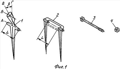 В крайнем рабочем положении инструмента (см. фиг.3) выступ на перемычке ограничивает поворот зубьев ряда 2 относительно основы 1 на угол . Сама перемычка с втулками выполнена так, что в исходном положении (см. фиг.2), касаясь основы 1, находится с ней в одной плоскости. Предлагаемый инструмент снабжен V-образным пружинным упором 6, выполненным из стали 65Г, У8А…10А, кл.1, одна сторона которого закреплена на втулочной части инструмента основы 1, а другая упирается в землю. Конец закрепленной стороны может выступать за края втулочной части инструмента, быть приплюснутым, конусным и на него может одеваться кольцо 7 (см. фиг.2). Другой же конец может быть снабжен пластиной с зубьями 8. Ось В втулочной части инструмента основы 1 расположена под углом к оси Г зуба основы 1.