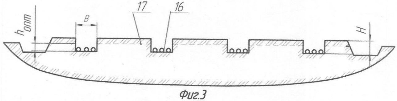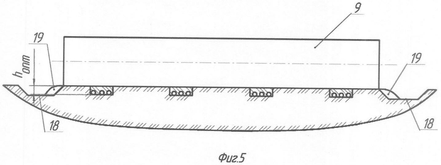 Сеялка агрегатируется трактором и осуществляет способ следующим образом. Семенной бункер 6 сеялки загружается семенами и устанавливается необходимая норма высева. В процессе движения агрегата бульдозерная лопатка 3 разравнивает поверхность посевной ленты, реборды 12 катка-бороздообразователя 4 формируют борозды глубиной Н, превышающей максимальную глубину заделки семян hmax, а колеса трактора формируют технологическую колею 18. Вращающиеся катушки высевающих аппаратов захватывают семена из семенного бункера 6 и по семяпроводам 7 направляют их на дно бороздок 16. Клиновидная бульдозерная лопатка заделывающего механизма сдвигает верхний слой почвы, находящегося над семенами выше уровня дна борозды на величину оптимальной глубины заделки семян hопт – на уровне плоскости 17. В процессе сдвигания упомянутого слоя почвы происходит одновременная заделка семян на оптимальную глубину и выравнивание микрорельефа поверхности посевной ленты, образуется общая гряда из нескольких посевных строк. Далее каток 9 окончательно прикатывает посевную ленту до нужной плотности. Излишки почвы 19 остаются на технологической колее 18.