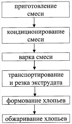 Способ производства хлопьев из зерновых, включающий приготовление смеси из рецептурных компонентов, обработку смеси в варочном экструдере, транспортирование экструдата к режущему устройству, резку его, формование хлопьев и обжаривание со снижением влажности до 1…4%, отличающийся тем, что смесь рецептурных компонентов перед подачей в варочный экструдер дополнительно кондиционируется водяным паром в горизонтальном смесителе непрерывного действия до достижения влажности 18…25% в течение 30…600 с, обработка смеси производится в варочном двухшнековом экструдере, транспортирование экструдата к режущему устройству осуществляется, по меньшей мере, одним одношнековым экструдером, резка экструдата на отдельные частицы произвольной формы выполняется вращающимся ножом, а формование хлопьев производится, по меньшей мере, одной парой гладких вальцов.