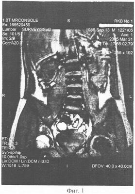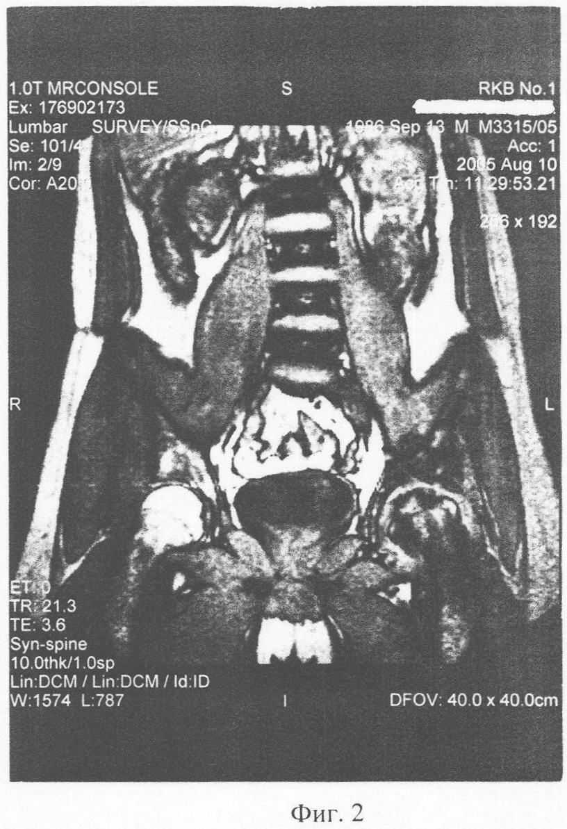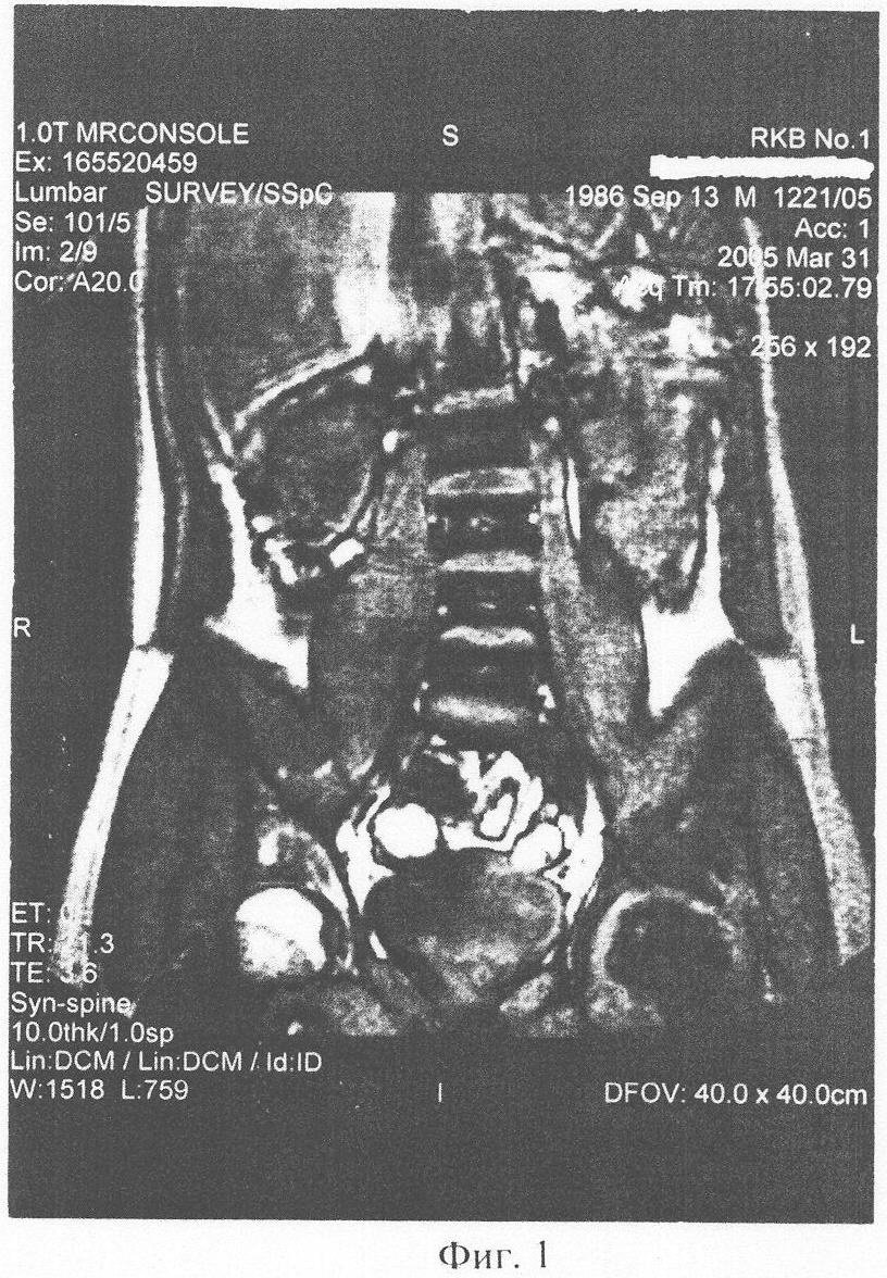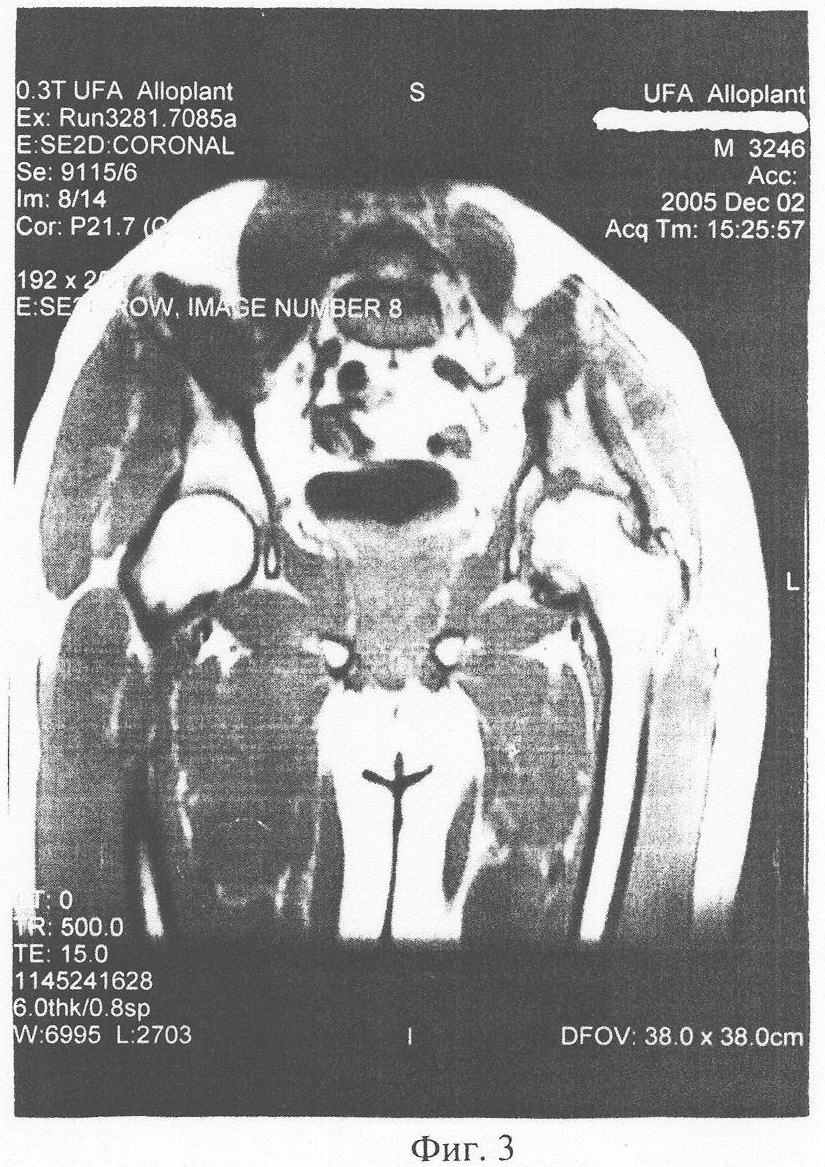 Клинический пример 1: Больной П., 19 лет, получил в ДТП травму: внутрисуставной перелом шейки левого бедра с разрывом связок и капсулы сустава. Находился 8 недель на консервативном лечении (скелетное вытяжение, иммобилизация большой тазобедренной гипсовой повязкой, облегчение осевой нагрузки костылями). Жалобы на постоянные боли в травмированном суставе, резкие боли при нагрузке сустава, резкое ограничение всех движений в суставе. Через 2,5 мес. после начала консервативного лечения боли усилились. На ЯМР-томографии (фиг.1), март 2005, выявляется асептический некроз головки левого тазобедренного сустава. Рекомендовано протезирование сустава. Был проведен 1 курс из 4-х сеансов, 1 раз в неделю: 50 мг биоматериала разводилось в 15 мл физ. раствора. Пациент укладывался в положение на здоровом боку. Весь полученный раствор вводился в виде инъекций в область trochanter major, с инфильтрацией прикрепленных к нему мышц (в энтезисы).