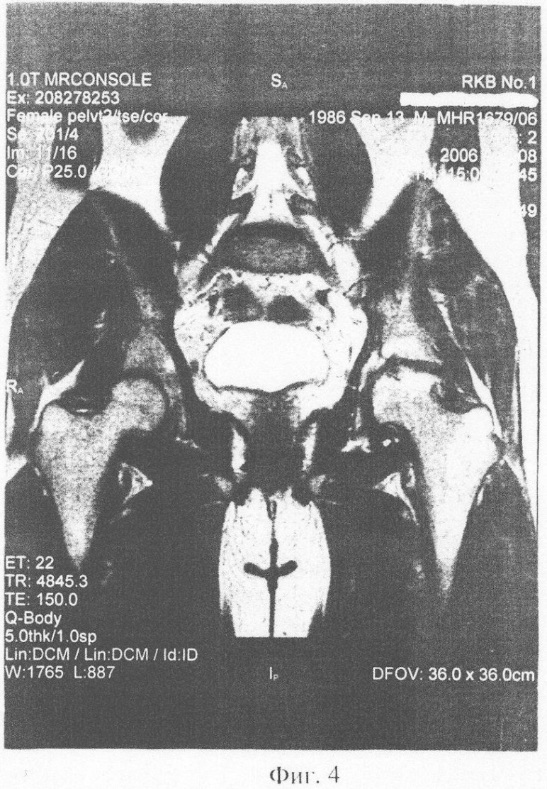 Очередной курс лечения был проведен в октябре 2005. В декабре ЯМР-томография (фиг.3): динамика положительная – появление ткани гидрофильной плотности, что свидетельствует о восстановлении питания хрящевой ткани и ее регенерации. Осевая нагрузка с применением костыля, в последующем – трости. В марте 2006 г, июле 2006 г проведены плановые очередные курсы введения ДБМА. ЯМР контроль в августе 2006 г (фиг.4) – появление конгруентности суставных поверхностей. Клинически: ходьба пациента свободная, без трости, движения в суставе в полном объеме, при осевой нагрузке болей нет.