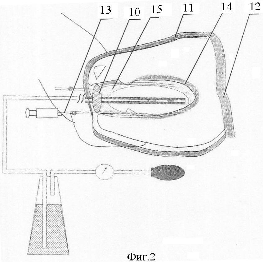 В раннем послеродовом периоде из половых путей появились обильные кровянистые выделения в объеме 300 мл. Сгустки рыхлые, количество выделений нарастает. Поставлен диагноз: Раннее послеродовое, гипотоническое кровотечение. При кровопотере 500 мл и продолжающемся кровотечении на фоне инфузионной терапии произведено ручное обследование полости матки, удалены пристеночные сгустки крови, целостность стенок матки не нарушена, произведен массаж матки на кулаке, наложены швы по Лосицкой, проводится инфузия утеротоников, матка склонна к расслаблению, кровотечение не прекращалось. Объем кровопотери достиг 650 мл. В 14 ч 00 мин в матку был введен баллон предлагаемой конструкции, в котором путем нагнетания стерильного физиологического раствора поддерживали давление 45-50 мм рт.ст. Произведена фиксация устройства тампоном и фиксирующими лентами на поясе.