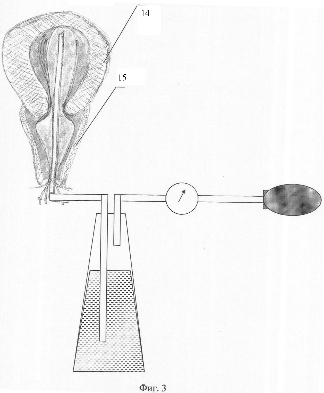 Способ осуществляют следующим образом. При продолжающихся маточных послеродовых гипотонических и атонических кровотечениях остановку их осуществляют следующим образом. Вводят в полость матки 14 предварительно сформированный, сложенный внутриматочный баллонный катетер 1, представляющий собой изделие – баллон 1 из эластичной медицинской резины, длина которого в сложенном виде не менее суммарной длины полости матки 14 и длины влагалища 15. Доставляющим опорным устройством 2 данного баллона 1 является трубчатый закругленный на дистальном конце элемент из мягкого эластичного формодержащего материала (полихлорвинил, силикон, резины и т.д.) длиной, сравнимой, но не менее суммарной длины полости матки 14 и длины влагалища 15. Диаметр трубки порядка 0,4-1,0 см для быстрого наполнения баллона 1 жидкостью. Кроме того, на внешней поверхности баллона 1 уложены и зафиксированы несколько трубок (ирригирующая и дренажные 3) из мягкого формодержащего материала (диаметра порядка 2-4 мм). Фиксацию названных трубок 3 осуществляют на конце баллона 1 во избежание препятствия его раздувания жидкостью. На трубках 3 имеются отверстия для осуществления медикаментозного орошения и для сбора отделяемого из полости матки 14.