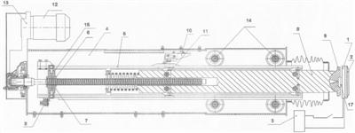 Дальнейшее движение прижима 5 ограничивается флажком ограничителя хода 11, установленным на гире 8. Как только пружина сожмется до усилия 200-500 Н, выключатель 10 обесточивает электропривод 12 и движение прижима 5 прекращается.