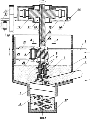 Ведомый ролик 9, изготовленный, например, из текстолита, посредством стоек 25 и кронштейна 26 закреплен на воронке 4 и установлен с возможностью жесткой фиксации в рабочем положении (винты фиксации на чертежах не показаны) и перемещения в направлениях, перпендикулярном и параллельном по отношению к оси симметрии воронки.
