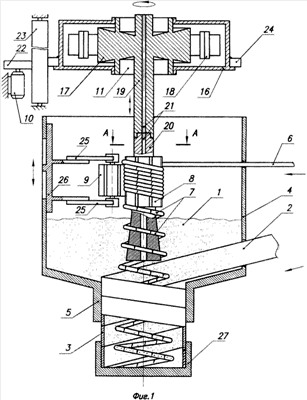 Затем в полость воронки 4 через отверстие, выполненное в ее стенке, вводят медную проволоку 6, имеющую диаметр, равный 2 мм. При этом свободный конец проволоки (см. фиг.2) располагают между ведущим 8 и ведомым 9 роликами и рукой обжимают его по поверхности ведущего ролика. Затем ведомый ролик (см. фиг.3) посредством стоек 25 прижимают к ведущему ролику и жестко фиксируют его положение. В результате такого перемещения буртик 13 ведомого ролика 9 вдавливает проволоку 6 в углубление 12 ведущего ролика 8 и образует на ней первый выступ 14 будущей пружины (внутренний диаметр радиусных участков 16 мм, шаг витков 6 мм). После этого на некоторое время, необходимое, для того чтобы пружина 7 своим концом соприкоснулась с дном крышки 27, включают электродвигатель 10. Вследствие этого вращения на ведущем ролике 8 (см. фиг.4) образуются первые витки пружины 7, оснащенные соответствующими выступами 14, которые обращены в одну сторону, выполнены с одинаковыми формой и размерами, ориентированы в плоскости, перпендикулярной к продольной оси оболочки, отделены один от другого равными между собой радиусными участками 15 и имеют высоту, равную 8 миллиметрам, которая в четыре раза превышает диаметр проволоки.