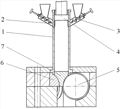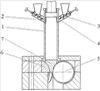 После окончания заполнения порошком бункера 1 заслонки 2 закрываются, толкатель 4 начинает совершать рабочий ход, порошок при этом значительно уплотняется в бункере-контейнере 1, а далее с участием профилированных проводок 6 – в растворе валкового узла.