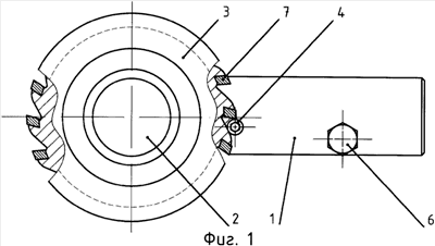 Для смены изношенного зуба производится поворот фрезы на следующий зуб. С этой целью винт 8 отвинчивается на 1-1,5 оборота, затем вывинчивается шпилька 6. Фреза освобождается и вместе с осью 2, поворачивается до тех пор, пока новый зуб не займет положения изношенного. Шпилька 6 снова заводится в канавку между зубьями, завинчивается до конца, после чего ось с фрезой затягивается винтом 8 в державке до упора в нее торцем фрезы. Регулировка углового положения резца не требуется.