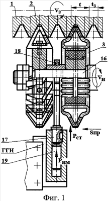 Волновод 17 гидравлического генератора импульсов (ГГИ) свободным концом соединен через подшипник 18 с валом 16, на котором жестко закреплены деформирующие инструменты 2 и 3. Статическое нагружение Рст инструментов осуществляется посредством ГГИ, и величина статической силы деформирования выбирается наибольшей из обеспечивающих упругие контактные деформации обрабатываемого материала.