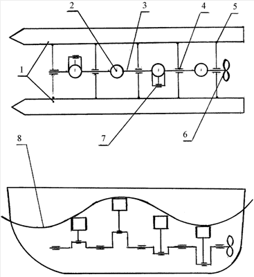 В предлагаемом нами изобретении техническое решение задачи размещения волнодвижительной установки осуществляется таким образом, что все ее компоненты находятся между корпусами катамарана. Устройство судового волнодвижителя, размещенного на катамаране 1 (см. чертеж) состоит из поплавков 2, имеющих положительную плавучесть и совершающих вертикальные колебания при прохождении волны между корпусами катамарана. Поплавки, связанные через кривошипно-шатунный механизм 7 с коленчатым валом 3, лежащим на опорных подшипниках 4, жестко связанных с помощью кронштейнов 5 с корпусами катамарана. На кормовую часть коленчатого вала насажен гребной винт 6.