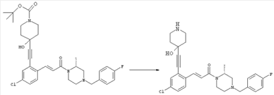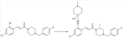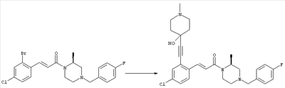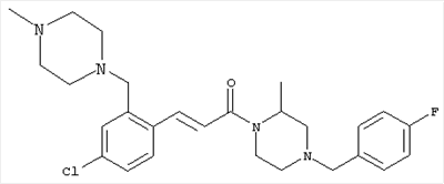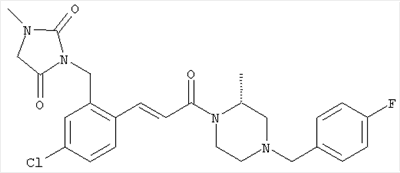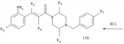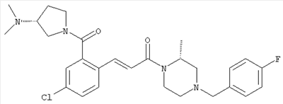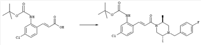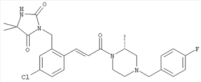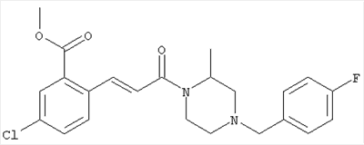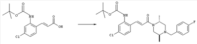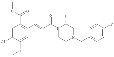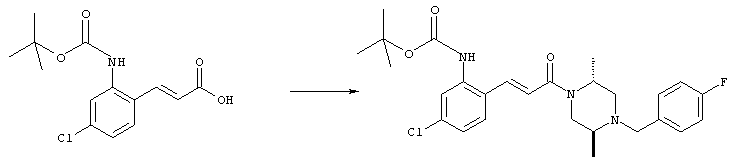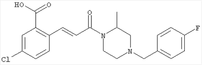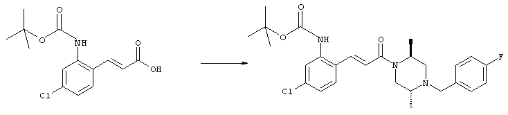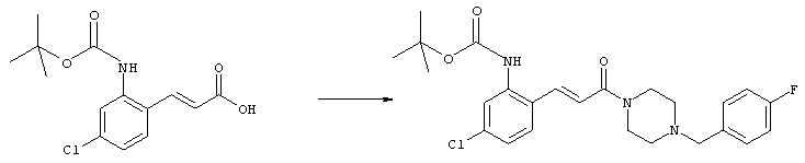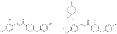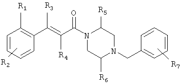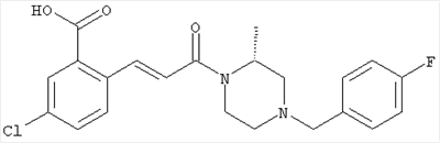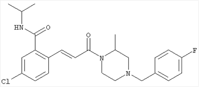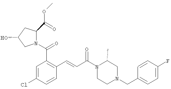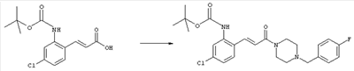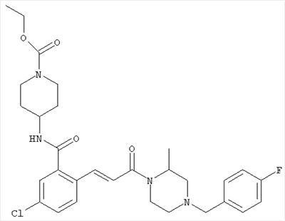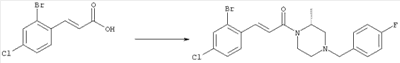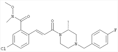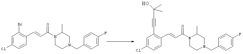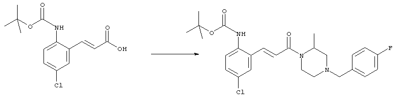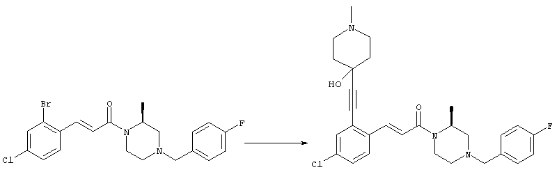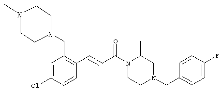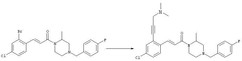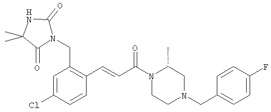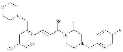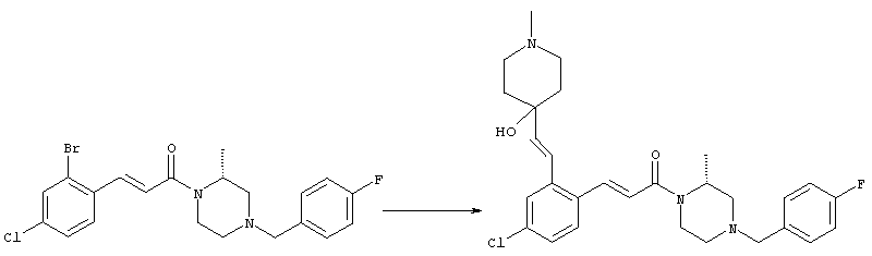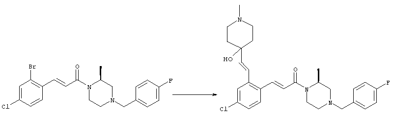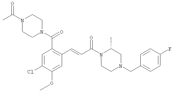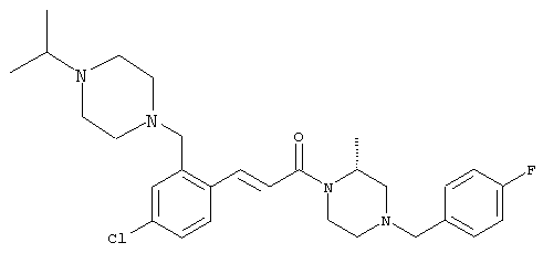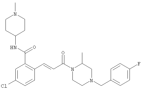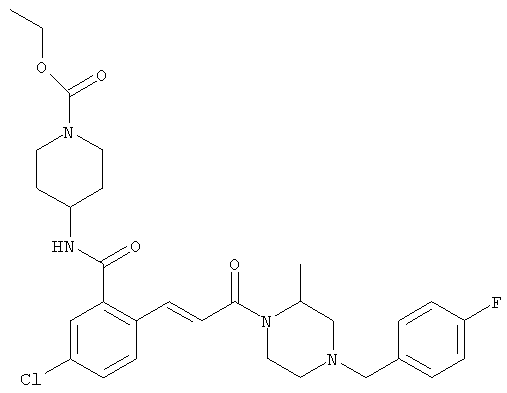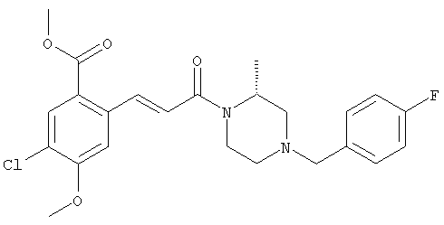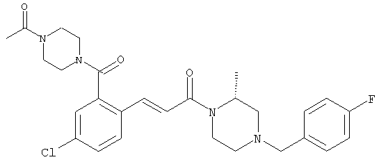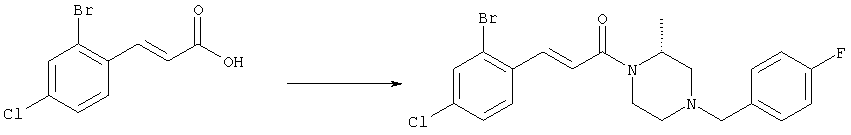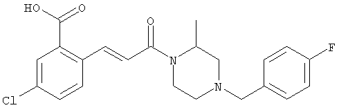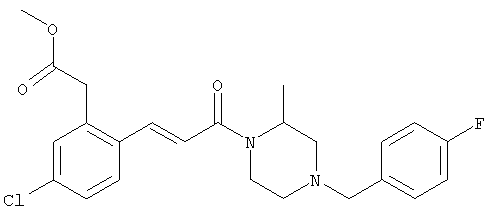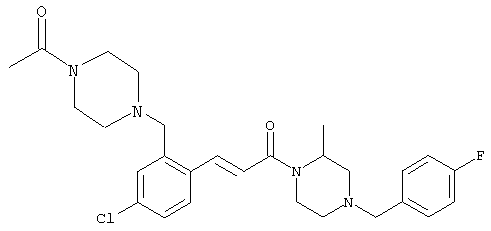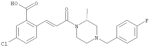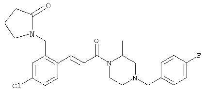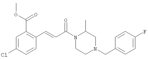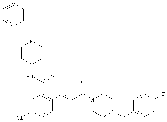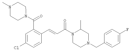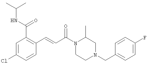 1H-ЯМР (400 МГц, ДМСО-d6): 3,28 (s, 3Н), 3,46 (s, 3H), 7,42 (dd, 1H), 7,59 (d, 1H), 7,68 (d, 1H). MC (EI) m/z: 277 [M]+. б) 5-Хлор-2-{(Е)-3-[(R)-4-(4-фторбензил)-2-метилпиперазин-1-ил]-3-оксопропенил}-N-метокси-N-метилбензамид 1H-ЯМР (400 МГц, ДМСО-d6): 1,24 (ушир. s, 3Н), 1,87-2,18 (m, 2H), 2,16 (d, 1H), 2,82 (d, 1H), 2,90-3,15 (m, 1H), 3,31 (s, 3Н), 3,33 (s, 3Н), 3,36-3,58 (m, 2H), 4,02-4,30 (m, 1H), 4,35-4,70 (m, 1H), 7,15 (t, 2H), 7,23 (d, 1H), 7,30-7,38 (m, 3Н), 7,50 (s, 1H), 7,53 (d, 1H), 8,01 (d, 1H). MC (ESI+) m/z: 460 [M+H]+, 482 [M+Na]+. Пример 78 Метиловый эфир 5-хлор-2-{(Е)-3-[4-(4-фторбензил)-2-метилпиперазин-1-ил]-3-оксопропенил}бензойной кислоты 1Н-ЯМР (400 МГц, ДМСО-d6): 1,25 (ушир. s, 3Н), 1,86-2,19 (m, 2H), 2,66 (d, 1H), 2,83 (d, 1H), 2,87-3,08 (m, 1H), 3,43 и 3,52 (AB-Sys., 2H), 3,88 (s, 3Н), 4,04-4,72 (m, 2H), 7,12-7,20 (m, 3Н), 7,38 (t, 2H), 7,70 (d, 1H), 7,84 (s, 1H), 7,95-8,04 (m, 2H). MC (ESI+): 431 [M+H]+. Пример 79 Метиловый эфир (5-хлор-2-{(Е)-3-[4-(4-фторбензил)-2-метилпиперазин-1-ил]-3-оксопропенил}фенил)уксусной кислоты 1Н-ЯМР (400 МГц, ДМСО-d6): 1,24 (ушир. s, 3Н), 1,88-2,17 (m, 2H), 2,65 (d, 1Н), 2,82 (d, 1H), 2,87-3,13 (m, 1H), 3,43 и 3,52 (AB-Sys., 2H), 3,61 (s, 3Н), 3,88 (s, 2H), 4,05-4,68 (m, 2H), 7,12 (d, 1H), 7,16 (t, 2H), 7,33-7,40 (m, 3Н), 7,42 (d, 1H), 7,54 (d, 1H), 7,86 (d, 1H). MC (ESI+): 467 [M+Na]+. Пример 80 5-Хлор-2-{(Е)-3-[4-(4-фторбензил)-2-метилпиперазин-1-ил]-3-оксопропенил}бензойная кислота Метиловый эфир 5-хлор-2-{(Е)-3-[4-(4-фторбензил)-2-метилпиперазин-1-ил]-3-оксопропенил}бензойной кислоты (1,56 г, 3,6 ммоля, пример 78) суспендировали в 20 мл смеси метанол/вода (1:1), затем добавляли 0,5 мл 10н. NaOH и смесь перемешивали в течение ночи. Смесь подкисляли добавлением 6,5 мл 1н. HCl, при этом получали продукт в виде осадка. Осадок отделяли фильтрованием и сушили, при этом получали 1,32 г (3,2 ммоля, 87%) требуемой кислоты. 1H-ЯМР (400 МГц, ДМСО-d6): 124 (ушир. s, 3Н), 1,88-2,17 (m, 2H), 2,65 (d, 1H), 2,82 (d, 1H), 2,86-3,06 (m, 1H), 3,43 и 3,52 (AB-Sys., 2H), 4,02-4,70 (m, 2H), 7,05 (d, 1H), 7,17 (t, 2H), 7,38 (dd, 2H), 7,42-7,53 (m, 1H), 7,64 (ушир. s, 1H), 7,84 (d, 1H), 8,12 (d, 1H), COOH не наблюдается. MC (ESI+): 417 [M+H]+. Пример 81 5-Хлор-2-{(Е)-3-[(R)-4-(4-фторбензил)-2-метилпиперазин-1-ил]-3-оксопропенил}бензойная кислота 5-Хлор-2-{(Е)-3-[(R)-4-(4-фторбензил)-2-метилпиперазин-1-ил]-3-оксопропенил}бензойную кислоту получали из (R)-1-(4-фторбензил)-3-метилпиперазина аналогично тому, как описано выше. Данные спектроскопического анализа соответствовали рацемической смеси. Пример 82 (Е)-3-[4-Хлор-2-(4-метилпиперазин-1-карбонил)фенил]-1-[4-(4-фторбензил)-2-метилпиперазин-1-ил]пропенон Бензойную кислоту (0,15 г, 0,36 ммоля, пример 80), 43 мг N-метилпиперазина (0,43 ммоля), 83 мг EDCI (0,43 ммоля) и 58 мг HOBt (0,43 ммоля) растворяли в 5 мл ДМФА. Реакционную смесь перемешивали в течение ночи, затем распределяли между этилацетатом и раствором бикарбоната натрия. Затем органическую фазу промывали водой и солевым раствором, растворитель удаляли, при этом получали неочищенный продукт, который очищали перекристаллизацией из ацетонитрила, при этом получали 75 мг (0,15 ммоля, 42%) требуемого амида. 1Н-ЯМР (400 МГц, ДМСО-d6): 1,24 (ушир. s, 3Н), 1,87-2,14 (m, 4H), 2,21-2,35 (m, 2H), 2,65 (d, 1H), 2,82 (d, 1H), 2,91-3,18 (m, 3Н), 3,37-3,56 (m, 3Н), 3,77-3,88 (m, 1H), 4,00-4,68 (m, 2H), 7,17 (t, 2H), 7,24 (d, 1H), 7,35 (d, 1H), 7,36 (dd, 2H), 7,40 (d, 1H), 7,53 (dd, 1H), 8,02 (d, 1H). MC (ESI+): 499 [М+Н]+. Следующие продукты получали аналогично тому, как описано выше: Пример 83 5-Хлор-2-{(Е)-3-[4-(4-фторбензил)-2-метилпиперазин-1-ил]-3-оксопропенил}-N-изопропилбензамид 1Н-ЯМР (400 МГц, ДМСО-d6): 11,5 (d, 6H), 1,24 (ушир. s, 3Н), 1,87-2,15 (m, 2H), 2,65 (d, 1H), 2,82 (d, 1H), 2,88-3,08 (m, 1H), 3,42 и 3,52 (AB-Sys., 2H), 4,04 (септет, 1H), 4,08-4,68 (m, 2H), 7,17 (t, 2H), 7,19 (d, 1H), 7,37 (dd, 2H), 7,40 (d, 1H), 7,53 (dd, 1H), 7,62 (d, 1H), 7,97 (d, 1H), 8,40 (d, 1H). MC (ESI+): 458 [M+H]+. Пример 84 5-Хлор-2-{(Е)-3-[4-(4-фторбензил)-2-метилпиперазин-1-ил)-3-оксопропенил} -N-(1-метилпиперидин-4-ил)бензамид 1H-ЯМР (400 МГц, ДМСО-d6): 1,23 (ушир. s, 3Н), 1,45-1,57 (m, 2H), 1,74-1,83 (m, 2H), 1,87-2,15 (m, 5H), 2,17 (s, 3Н), 2,60-2,86 (m, 4H), 3,42 и 3,57 (АВ-Sys., 2H), 3,63-3,75 (m, 1H), 4,00-4,68 (m, 2H), 7,17 (t, 2H), 7,19 (d, 1H), 7,36 (d