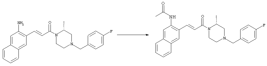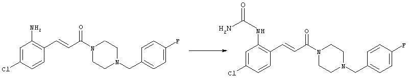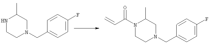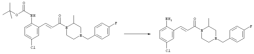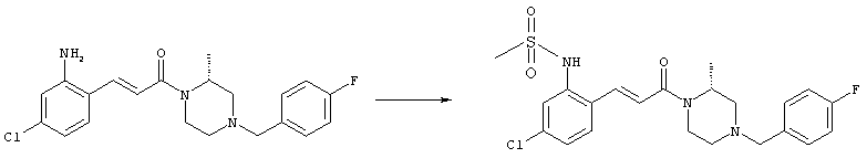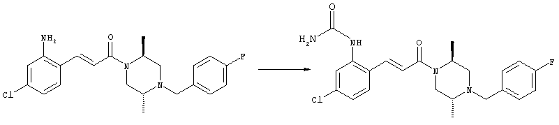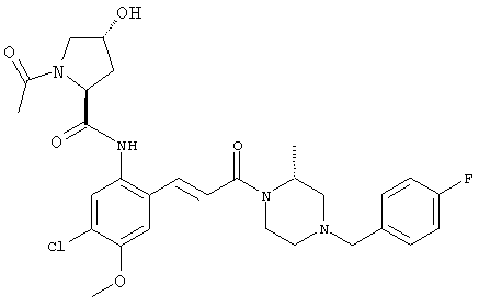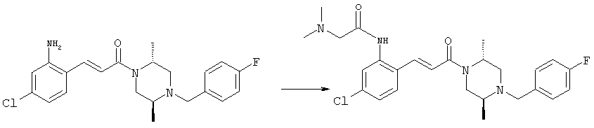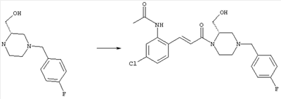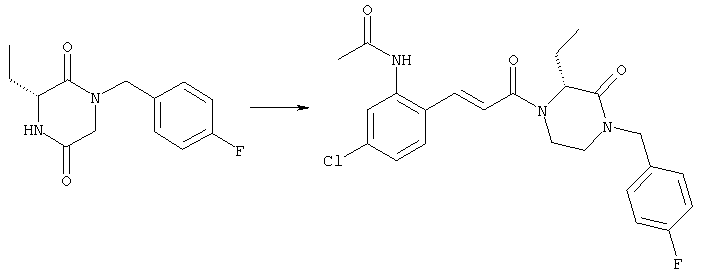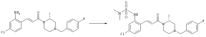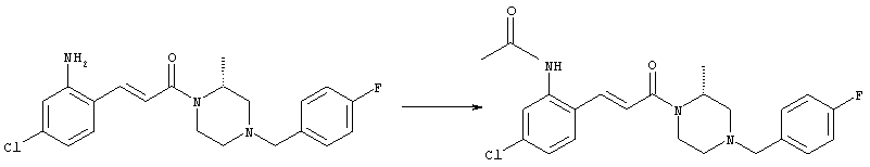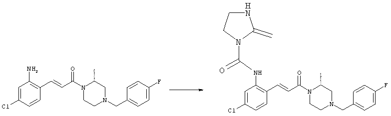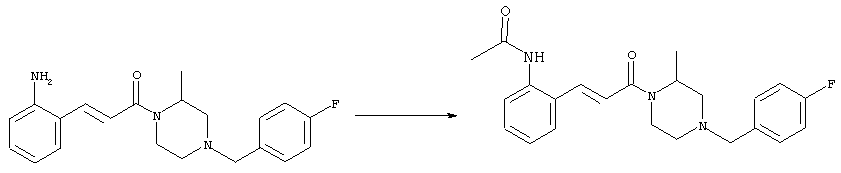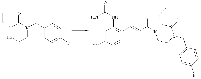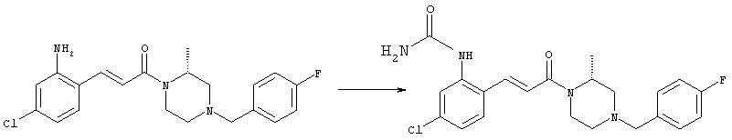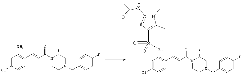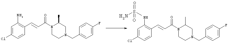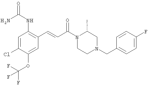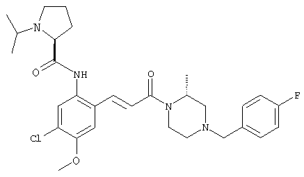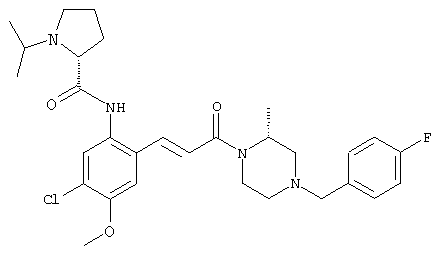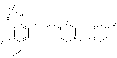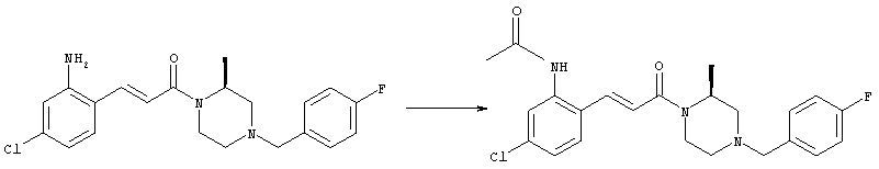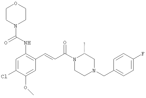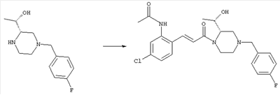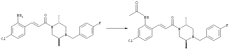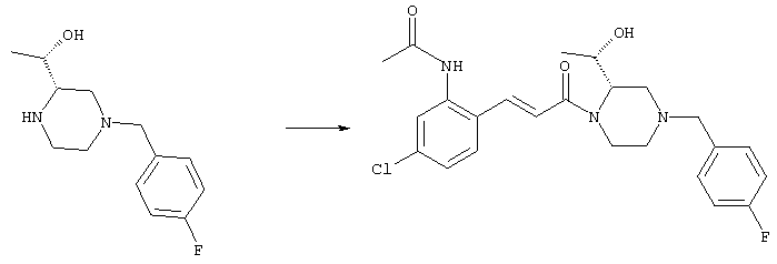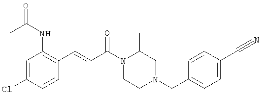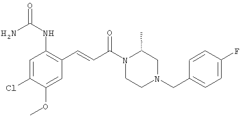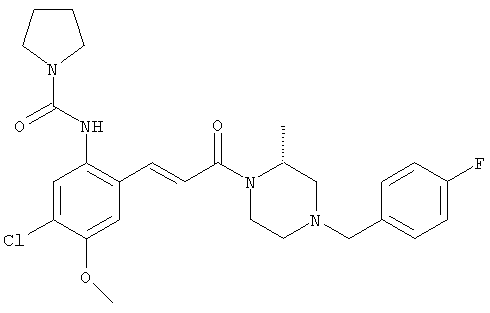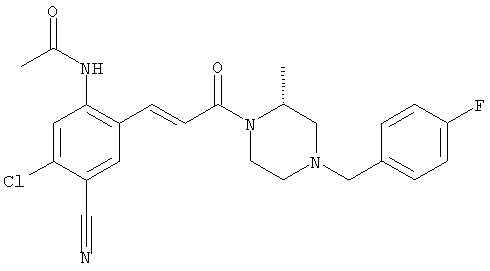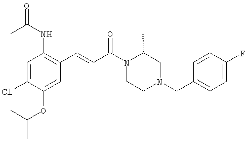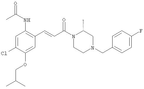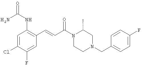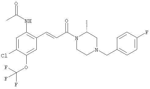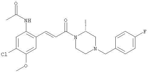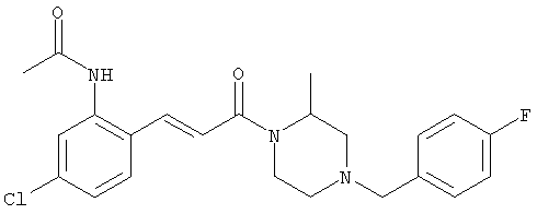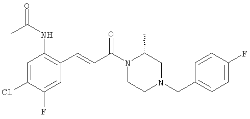 Смесь 0,10 г (0,58 ммоля) 1-ацетилпиперидин-4-карбоновой кислоты, 0,25 г (0,64 ммоля) (Е)-3-(2-амино-4-хлорфенил)-1-[(R)-4-(4-фторбензил)-2-метилпиперазин-1-ил]пропенона, 0,13 г (0,70 ммоля) EDCI и 0,095 г (0,70 ммоля) HOBt в 10 мл ДМФА перемешивали при комнатной температуре в течение 16 ч. Неочищенный продукт, полученный после добавления воды и экстракции этилацетатом, очищали обращенно-фазовой ЖХВР и при этом получали требуемый амид (выход 68 мг, 22%). 1Н ЯМР (400 МГц, ДМСО-d6): 1,24 (ушир.s, 3Н), 1,45 (qd, 1H), 1,59 (qd, 1H), 1,78-2,15 (m, 4H), 2,01 (s, 3Н), 2,50-2,74 (m, 4H), 2,81 (d, 1H), 3,08 (td, 1H), 3,42 и 3,52 (AB-Sys., 2H), 3,87 (d, 1H), 4,05-4,70 (m, 3Н), 7,16 (t, 2H), 7,17 (d, 1H), 7,28 (dd, 1H), 7,35 (dd, 2H), 7,50 (d, 1H), 7,58 (d, 1H), 7,89 (d, 1H), 9,84 (s, 1H). MC (ESI+) m/z: 541 [M+H]+ Пример 9 (5-Хлор-2-[(Е)-3-[(R)-4-(4-фторбензил)-2-метилпиперазин-1-ил]-3-оксопропенил]фенил)амид 1-метил-1Н-имидазол-4-сульфоновой кислоты (Е)-3-(2-Амино-4-хлорфенил)-1-[(R)-4-(4-фторбензил)-2-метилпиперазин-1-ил]пропенон (100 мг, 0,26 ммоля) растворяли в пиридине (6 мл) и при перемешивании обрабатывали 1-метилимидазол-4-сульфонилхлоридом (51 мг, 0,284 ммоля) при 0°С. Реакционную смесь перемешивали при комнатной температуре в течение ночи, растворитель упаривали и реакционную смесь очищали препаративной ЖХВР (Waters XTerra, элюент: Н2О/ацетонитрил, градиент 20-100%), выход 32 мг. 1H ЯМР (400 МГц, ДМСО-d6, 396К): 1,28 (d, 3Н), 2,02 (td, 2H), 2,18 (dd, 1H), 2,68 (ушир.d, 1H), 3,16 (td, 1H), 3,48 (q, 2H), 3,66 (s, 3Н), 4,1 (ушир.d, 1H), 4,5 (ушир.m, 1H), 6,92 (d, 1H), 7,08 (т, 2H), 7,18 (d, 1H), 7,32 (т, 3Н), 7,55 (s, 1H), 7,58 (d, 1H), 7,64 (s, 1H), 7,66 (s, 1H), 9,8 (NH, 1H). MC (ES+) m/z: 532,1 (МН+, 100%). Пример 10 N-[5-(5-Хлор-2-[(Е)-3-[(R)-4-(4-фторбензил)-2-метилпиперазин-1-ил]-3-оксопропенил]фенилсульфамоил)тиазол-2-ил]ацетамид (Е)-3-(2-Амино-4-хлорфенил)-1-[(R)-4-(4-фторбензил)-2-метилпиперазин-1-ил]пропенон (99,69 мг, 0,26 ммоля) растворяли в пиридине (6 мл) и при перемешивании обрабатывали 2-ацетамидо-4-метил-5-тиазолсульфонилхлоридом (72 мг, 0,283 ммоля) при 0°С. Реакционную смесь перемешивали при комнатной температуре в течение ночи, растворитель упаривали и реакционную смесь очищали препаративной ЖХВР (Waters XTerra, элюент: Н2О/ацетонитрил, градиент 20-100%), выход 46 мг. 1H ЯМР (400 МГц, ДМСО-d6, 396 ): 1,28 (d, 3Н), 2,02 (td, 2H), 2,14 (s, 3H), 2,18 (dd, 1H), 2,28 (s, 3H), 2,68 (ушир.d, 1H), 2,82 (m, 1H,+H2O), 4,8 (q, 2H), 4,08 (ушир.d, 1H), 4,48 (ушир.m, 1H), 6,92 (d, 1H), 7,05 (m, 2H), 7,12 (m, 1H), 7,2-7,4 (m, 3Н), 7,6 (d, 1H), 7,77 (d, 1H). MC (ES+) m/z: 606,02 (MH+). Пример 11 (5-Хлор-2-[(Е)-3-[(R)-4-(4-фторбензил)-2-метилпиперазин-1-ил]-3-оксопропенил]фенил)амид 2-оксоимидазолидин-1-карбоновой кислоты (Е)-3-(2-Амино-4-хлорфенил)-1-[(R)-4-(4-фторбензил)-2-метилпиперазин-1-ил]пропенон (100,08 мг, 0,387 ммоля) растворяли в дихлорметане (5 мл) и при перемешивании обрабатывали 2-оксо-1-имидазолидинкарбонилхлоридом (89,8 мг, 0,580 ммоля) при 0°С. Реакционную смесь перемешивали при комнатной температуре в течение ночи, образовавшийся кристаллический продукт отфильтровывали, промывали дихлорметаном и сушили в вакууме, выход 172 мг (88%), tпл. 275-277°С (без поправки). 1Н ЯМР (400 МГц, ДМСО-d6, 396[К]): 1,38 (d, 3Н), 2,6 (ушир.s, 1H), 2,78 (ушир.s, 1H), 2,92 (m, 1H), 3,18 (ушир.s, 1H), 3,41 (m, 3Н), 3,8 (m, 2H), 3,98 (ушир.d, 2H), 4,25 (d, 1H), 4,68 (ушир.s, 1H), 7,0 (d, 1H), 7,12 (m, 3Н), 7,46 (ушир.s, 1H), 7,58 (m, 3Н), 7,65 (d, 1H), 8,0 (d, 1H), 10,58 (ушир.s, 1H, NH). MC (ES+) m/z: 500,2 (MH+, 58% ), 173,1 (100%). MC (ES–) m/z: 498,2 (M-H, 13% ), 534,2 (100%, M+Cl–), 612,3 (8%, М+CF3СО2 –). Пример 12 N-(4-Хлор-2-[(Е)-3-[4-(4-фторбензил)-2-метилпиперазин-1-ил]-3-оксопропенил]фенил)метилтио-N’-цианотиомочевина (Е)-3-(2-Амино-4-хлорфенил)-1-[4-(4-фторбензил)-2-метилпиперазин-1-ил]пропенон (200 мг, 0,51 ммоля) (рацемат, полученный по аналогичной методике, как описано выше для R-энантиомера из рацемата 1-(4-фторбензил)-3-метилпиперазина (см. статью Bolos Jordi и др., J. Med. Chem., т. 39(15), сс. 2962-2970, (1996)) в ТГФ (5 м