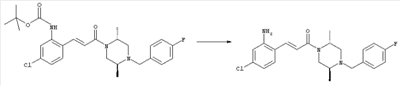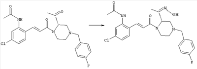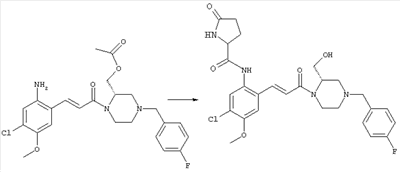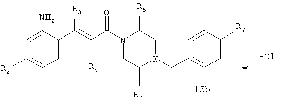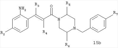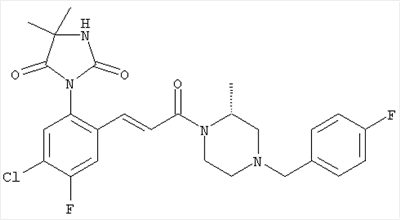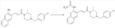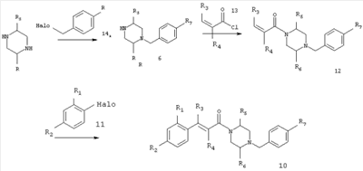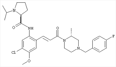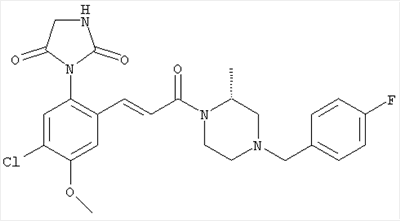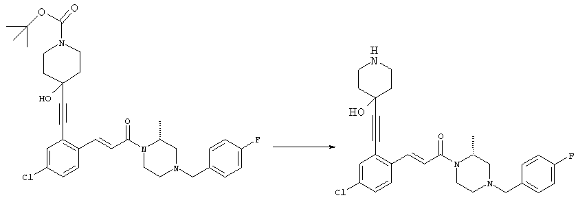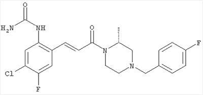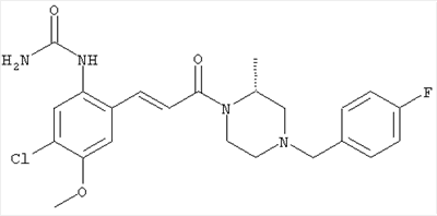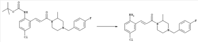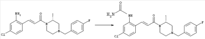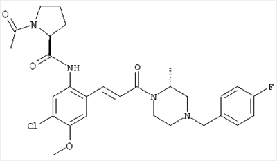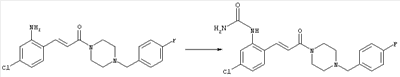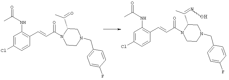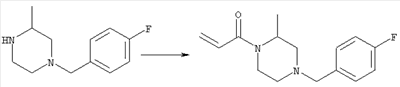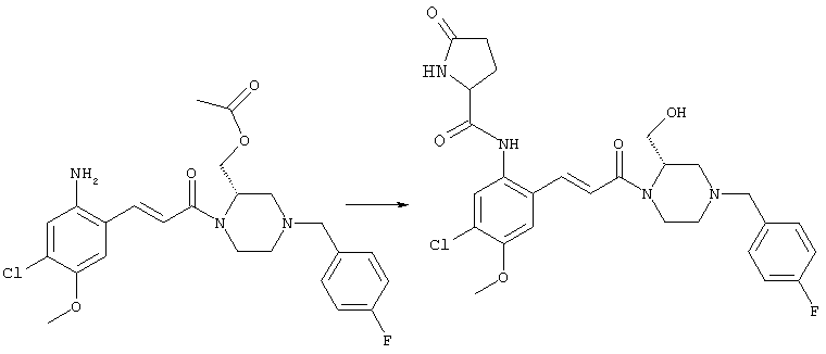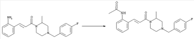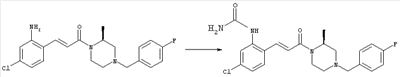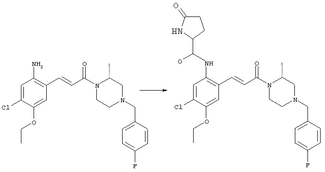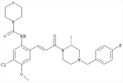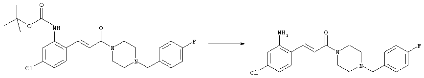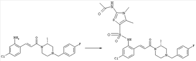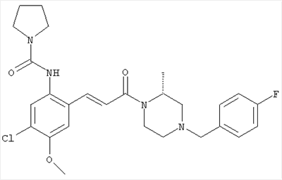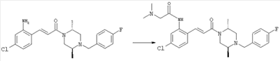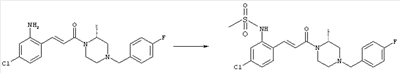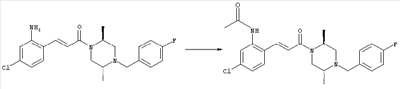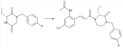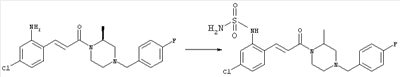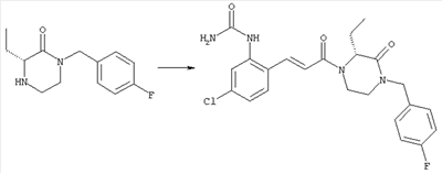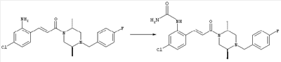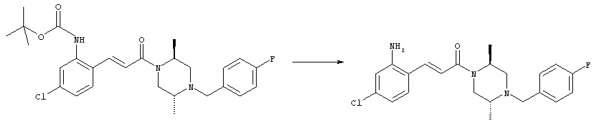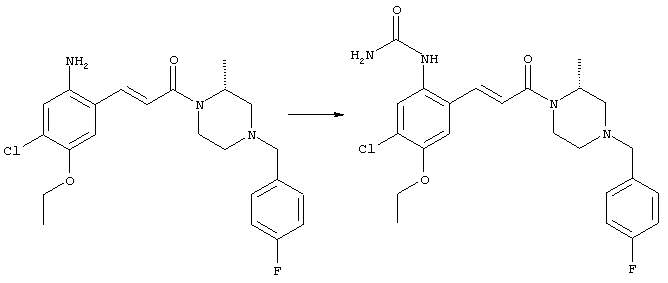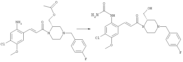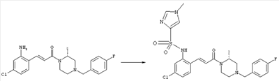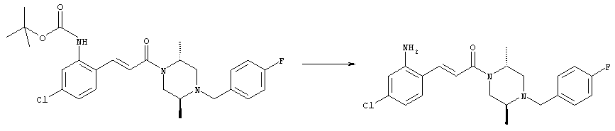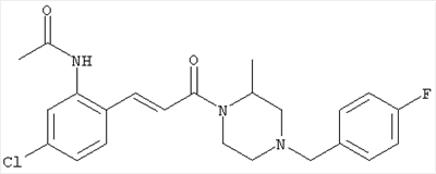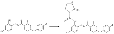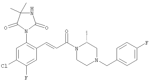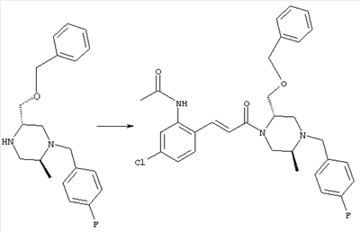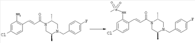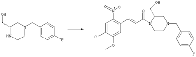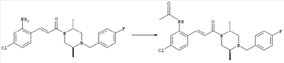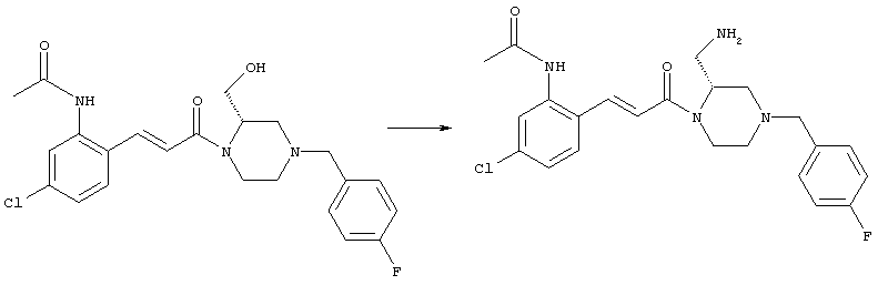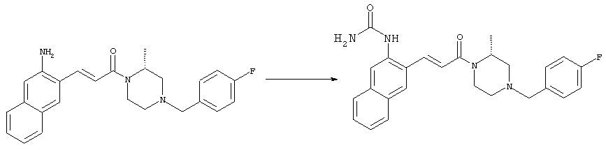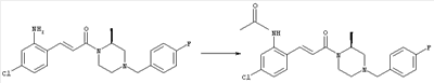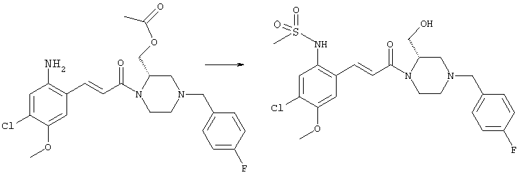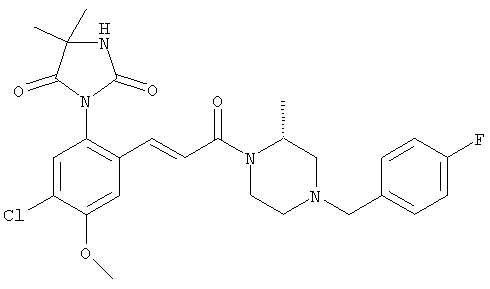 Смесь 0,10 г (0,58 ммоля) 1-ацетилпиперидин-4-карбоновой кислоты, 0,25 г (0,64 ммоля) (Е)-3-(2-амино-4-хлорфенил)-1-[(R)-4-(4-фторбензил)-2-метилпиперазин-1-ил]пропенона, 0,13 г (0,70 ммоля) EDCI и 0,095 г (0,70 ммоля) HOBt в 10 мл ДМФА перемешивали при комнатной температуре в течение 16 ч. Неочищенный продукт, полученный после добавления воды и экстракции этилацетатом, очищали обращенно-фазовой ЖХВР и при этом получали требуемый амид (выход 68 мг, 22%). 1Н ЯМР (400 МГц, ДМСО-d6): 1,24 (ушир.s, 3Н), 1,45 (qd, 1H), 1,59 (qd, 1H), 1,78-2,15 (m, 4H), 2,01 (s, 3Н), 2,50-2,74 (m, 4H), 2,81 (d, 1H), 3,08 (td, 1H), 3,42 и 3,52 (AB-Sys., 2H), 3,87 (d, 1H), 4,05-4,70 (m, 3Н), 7,16 (t, 2H), 7,17 (d, 1H), 7,28 (dd, 1H), 7,35 (dd, 2H), 7,50 (d, 1H), 7,58 (d, 1H), 7,89 (d, 1H), 9,84 (s, 1H). MC (ESI+) m/z: 541 [M+H]+ Пример 9 (5-Хлор-2-[(Е)-3-[(R)-4-(4-фторбензил)-2-метилпиперазин-1-ил]-3-оксопропенил]фенил)амид 1-метил-1Н-имидазол-4-сульфоновой кислоты (Е)-3-(2-Амино-4-хлорфенил)-1-[(R)-4-(4-фторбензил)-2-метилпиперазин-1-ил]пропенон (100 мг, 0,26 ммоля) растворяли в пиридине (6 мл) и при перемешивании обрабатывали 1-метилимидазол-4-сульфонилхлоридом (51 мг, 0,284 ммоля) при 0°С. Реакционную смесь перемешивали при комнатной температуре в течение ночи, растворитель упаривали и реакционную смесь очищали препаративной ЖХВР (Waters XTerra, элюент: Н2О/ацетонитрил, градиент 20-100%), выход 32 мг. 1H ЯМР (400 МГц, ДМСО-d6, 396К): 1,28 (d, 3Н), 2,02 (td, 2H), 2,18 (dd, 1H), 2,68 (ушир.d, 1H), 3,16 (td, 1H), 3,48 (q, 2H), 3,66 (s, 3Н), 4,1 (ушир.d, 1H), 4,5 (ушир.m, 1H), 6,92 (d, 1H), 7,08 (т, 2H), 7,18 (d, 1H), 7,32 (т, 3Н), 7,55 (s, 1H), 7,58 (d, 1H), 7,64 (s, 1H), 7,66 (s, 1H), 9,8 (NH, 1H). MC (ES+) m/z: 532,1 (МН+, 100%). Пример 10 N-[5-(5-Хлор-2-[(Е)-3-[(R)-4-(4-фторбензил)-2-метилпиперазин-1-ил]-3-оксопропенил]фенилсульфамоил)тиазол-2-ил]ацетамид (Е)-3-(2-Амино-4-хлорфенил)-1-[(R)-4-(4-фторбензил)-2-метилпиперазин-1-ил]пропенон (99,69 мг, 0,26 ммоля) растворяли в пиридине (6 мл) и при перемешивании обрабатывали 2-ацетамидо-4-метил-5-тиазолсульфонилхлоридом (72 мг, 0,283 ммоля) при 0°С. Реакционную смесь перемешивали при комнатной температуре в течение ночи, растворитель упаривали и реакционную смесь очищали препаративной ЖХВР (Waters XTerra, элюент: Н2О/ацетонитрил, градиент 20-100%), выход 46 мг. 1H ЯМР (400 МГц, ДМСО-d6, 396 ): 1,28 (d, 3Н), 2,02 (td, 2H), 2,14 (s, 3H), 2,18 (dd, 1H), 2,28 (s, 3H), 2,68 (ушир.d, 1H), 2,82 (m, 1H,+H2O), 4,8 (q, 2H), 4,08 (ушир.d, 1H), 4,48 (ушир.m, 1H), 6,92 (d, 1H), 7,05 (m, 2H), 7,12 (m, 1H), 7,2-7,4 (m, 3Н), 7,6 (d, 1H), 7,77 (d, 1H). MC (ES+) m/z: 606,02 (MH+). Пример 11 (5-Хлор-2-[(Е)-3-[(R)-4-(4-фторбензил)-2-метилпиперазин-1-ил]-3-оксопропенил]фенил)амид 2-оксоимидазолидин-1-карбоновой кислоты (Е)-3-(2-Амино-4-хлорфенил)-1-[(R)-4-(4-фторбензил)-2-метилпиперазин-1-ил]пропенон (100,08 мг, 0,387 ммоля) растворяли в дихлорметане (5 мл) и при перемешивании обрабатывали 2-оксо-1-имидазолидинкарбонилхлоридом (89,8 мг, 0,580 ммоля) при 0°С. Реакционную смесь перемешивали при комнатной температуре в течение ночи, образовавшийся кристаллический продукт отфильтровывали, промывали дихлорметаном и сушили в вакууме, выход 172 мг (88%), tпл. 275-277°С (без поправки). 1Н ЯМР (400 МГц, ДМСО-d6, 396[К]): 1,38 (d, 3Н), 2,6 (ушир.s, 1H), 2,78 (ушир.s, 1H), 2,92 (m, 1H), 3,18 (ушир.s, 1H), 3,41 (m, 3Н), 3,8 (m, 2H), 3,98 (ушир.d, 2H), 4,25 (d, 1H), 4,68 (ушир.s, 1H), 7,0 (d, 1H), 7,12 (m, 3Н), 7,46 (ушир.s, 1H), 7,58 (m, 3Н), 7,65 (d, 1H), 8,0 (d, 1H), 10,58 (ушир.s, 1H, NH). MC (ES+) m/z: 500,2 (MH+, 58% ), 173,1 (100%). MC (ES–) m/z: 498,2 (M-H, 13% ), 534,2 (100%, M+Cl–), 612,3 (8%, М+CF3СО2 –). Пример 12 N-(4-Хлор-2-[(Е)-3-[4-(4-фторбензил)-2-метилпиперазин-1-ил]-3-оксопропенил]фенил)метилтио-N’-цианотиомочевина (Е)-3-(2-Амино-4-хлорфенил)-1-[4-(4-фторбензил)-2-метилпиперазин-1-ил]пропенон (200 мг, 0,51 ммоля) (рацемат, полученный по аналогичной методике, как описано выше для R-энантиомера из рацемата 1-(4-фторбензил)-3-метилпиперазина (см. статью Bolos Jordi и др., J. Med. Chem., т. 39(15), сс. 2962-2970, (1996)) в ТГФ (5 м
