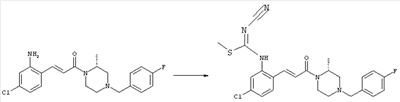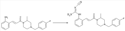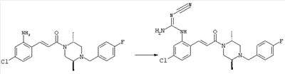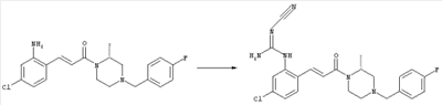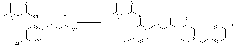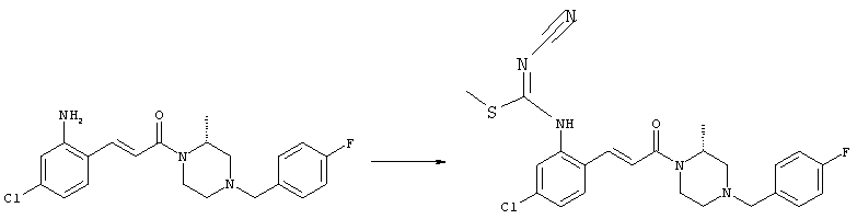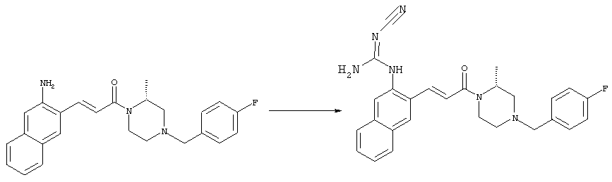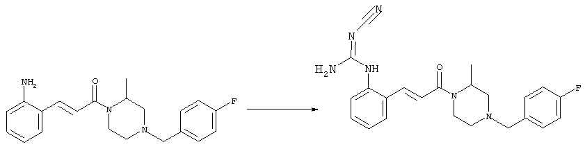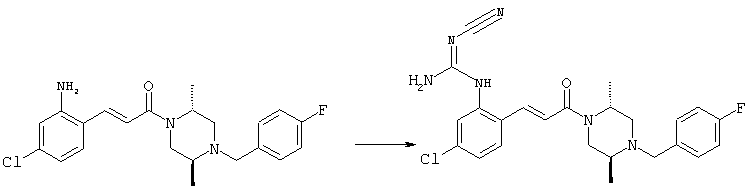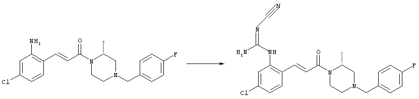 например, в присутствии пригодного конденсирующего агента, например, гидрохлорида EDCl, предпочтительно в инертном растворителе, таком как дихлорметан. Экспериментальная часть Сокращения Ас2О – ангидрид уксусной кислоты ВОС – трет-Бутоксикарбонил DCC – дициклогексилкарбодиимид ДХМ – дихлорметан DMAP – диметилпиридин-4-иламин ДМЭ – 1,2-диметоксиэтан ДМФА – N,N-диметилформамид EDCl – гидрохлорид (3-диметиламинопропил)этилкарбодиимида HCl – соляная кислота НОВТ – бензотриазол-1-ол NaOH – гидроксид натрия NEt3 – триэтиламин ТВМЕ – трет-бутилметиловый эфир ТФУ – трифторуксусная кислота ТГФ – тетрагидрофуран Примеры: Пример 1 N-(5-Хлор-2-[(Е)-3-[(R)-4-(4-фторбензил)-2-метилпиперазин-1-ил]-3-оксопропенил]фенил)-N’-цианогуанидин а) Метиловый эфир (Е)-3-(2-трет-бутоксикарбониламино-4-хлорфенил)акриловой кислоты Метиловый эфир (Е)-3-(2-амино-4-хлорфенил)акриловой кислоты (Carling, Robert W., и др., J. Med. Chem., т. 36(22), сс. 3397-408, (1993)) (3,3 г, 15,6 ммоля) в ТГФ (63 мл) смешивали с (ВОС)2О (6,8 г, 31,2 ммоля) и кипятили с обратным холодильником в течение 4 ч. ТГФ упаривали и добавляли вторую порцию (ВОС)2О (6,8 г, 31,2 ммоля). Полученную смесь нагревали при 100°С в течение 18 ч. После перекристаллизации из ТВМЕ/гексана получали указанное в заголовке соединение в виде бесцветных кристаллов (4,6 г, 94%). 1H ЯМР (400 МГц, ДМСО-d6): 1,46 (s, 9H), 3,72 (s, 3Н), 6,58 (d, 1H), 7,25 (dd, 1H), 7,47 (d, 1H), 7,72 (d, 1H), 7,82 (d, 1H), 9,33 (ушир.s, 1H, NH). MC (EI) m/z: 311 (M+, 20), 238 (10), 255 (20), 180 (70), 152 (65). б) (Е)-3-(2-трет-Бутоксикарбониламино-4-хлорфенил)акриловая кислота Метиловый эфир (Е)-3-(2-трет-бутоксикарбониламино-4-хлорфенил)акриловой кислоты (4,6 г, 14,7 ммоля) растворяли в МеОН (300 мл), добавляли 2н. NaOH (11 мл, 22 ммоля) и воду (147 мл), перемешивали при 50°С в течение 1 ч. Прозрачную реакционную смесь концентрировали до объема приблизительно 150 мл, подкисляли до рН 3 и дважды экстрагировали ТВМЕ. Объединенные органические фазы сушили над Na2SO4 и упаривали досуха, при этом получали указанное в заголовке соединение в виде бесцветных кристаллов (3,8 г, 87%). в) Трет-бутиловый эфир 5-хлор-2-[(Е)-3-[(R)-4-(4-фторбензил)-2-метилпиперазин-1-ил]-3-оксопропенил]фенилкарбаминовой кислоты (Е)-3-(2-трет-Бутоксикарбониламино-4-хлорфенил)акриловую кислоту (743 мг, 2,5 ммоля) и (R)-1-(4-фторбензил)-3-метилпиперазин (Hilger, Christoph-Stephan и др., WO 0236581) (520 мг, 2,5 ммоля) растворяли в СН2Cl2 (25 мл), смешивали с гидрохлоридом EDCl (480 мг, 2,5 ммоля) и перемешивали при комнатной температуре в течение 6 ч. Реакционную смесь очищали хроматографией (SiO2, элюент: EtOAc/гексан, градиент от 25:75 до 35:65), при этом получали указанное в заголовке соединение в виде бесцветной пены (1,0 г, 81%). 1Н ЯМР (400 МГц, ДМСО-d6): 1,26 (d, 3Н), 1,45 (s, 9H), 1,98 (dt, 1H), 2,13 (dd, 1H), 2,67 (d, 1H), 2,82 (d, 1H), 3,13 (ушир.t, 1H), 3,43 (d, 1H), 3,52 (d, 1H), 4,13 (ушир.d, 1H), 4,53 (ушир.s, 1H), 7,02 (d, 1H), 7,12 (dd, 2H), 7,19 (dd, 1H), 7,35 (dd, 2H), 7,45 (d, 1H), 7,60 (d, 1H), 7,73 (d, 1H), 8,81 (ушир.s, 1H). MC (ES+) m/z: 488,2 (МН+, 100). г) (Е)-3-(2-амино-4-хлорфенил)-1-[(R)-4-(4-фторбензил)-2-метилпиперазин-1-ил]пропенон Трет-бутиловый эфир 5-хлор-2-[(Е)-3-[(R)-4-(4-фторбензил)-2-метилпиперазин-1-ил]-3-оксопропенил]фенилкарбаминовой кислоты (1,0 г, 2,05 ммоля) растворяли в EtOH (4 мл) и конц. HCl (4 мл), а затем перемешивали при комнатной температуре в течение 30 мин. Реакционную смесь обрабатывали насыщенным раствором На2СО3 и трижды экстрагировали EtOAc. Объединенные органические фазы сушили над Na2SO4 и упаривали досуха, при этом получали указанное в заголовке соединение в виде кристаллов желтого цвета (630 мг, 80%). 1Н ЯМР (400 МГц, ДМСО-d6): 1,25 (ушир.s, 3Н), 1,95 (ушир.s, 1H), 2,10 (уш
