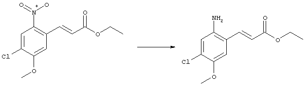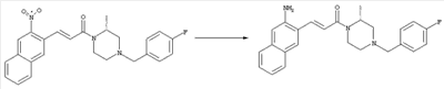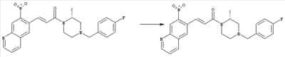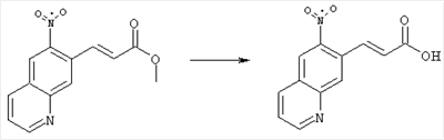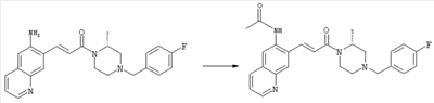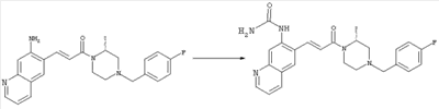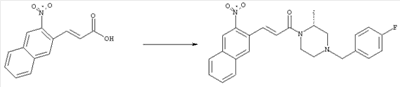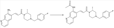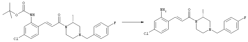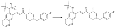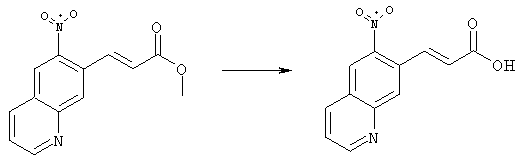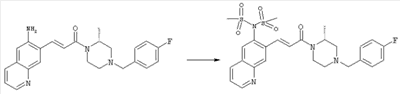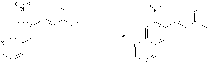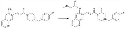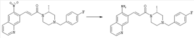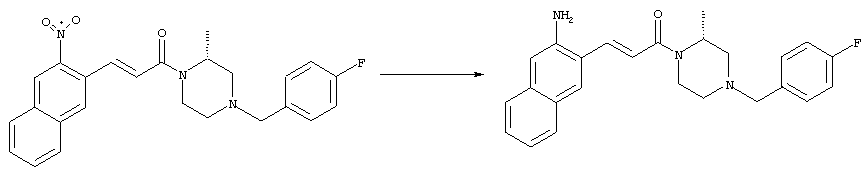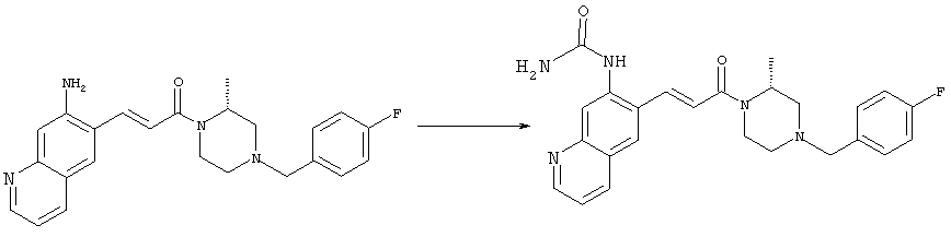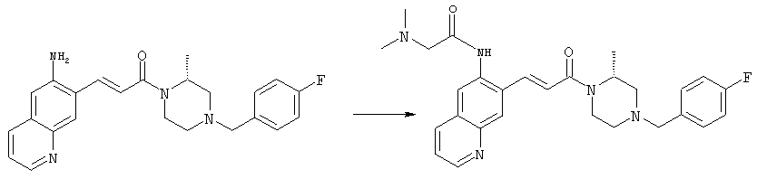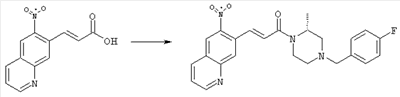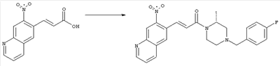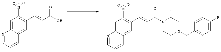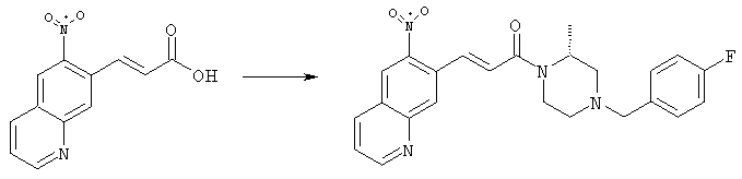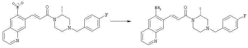 7-Метил-6-нитрохинолин (1,22 г, 6,5 ммоля) и трет-бутокси-бис(диметиламино)метан (5,2 мл, 27,3 ммоля) в ДМФА (13 мл) нагревали на масляной бане, предварительно нагретой до 160°С, в течение 15 мин. Реакционную смесь упаривали досуха, переносили в ТГФ (26 мл), при комнатной температуре в течение 1,5 ч добавляли NaIO4 (8,3 г, 39 ммолей) в воде (520 мл), перемешивали в течение 1 ч и затем дважды экстрагировали EtOAc. Объединенные органические фазы сушили над Na2SO4, упаривали и очищали хроматографией (SiO2, элюент: ТВМЕ), при этом получали указанное в заголовке соединение (920 мг, 70%) в виде пены желтого цвета. 1H ЯМР (400 МГц, ДМСО-d6): 7,87 (dd, 1Н), 8,51 (s, 1H), 8,73 (d, 1H), 8,97 (s, 1H), 9,22 (dd, 1H), 10,36 (s, 1H). MC (EI) m/z: 202 (M+, 20), 172 (40), 144 (25), 127(70), 116 (100), 89 (60). в) Метиловый эфир (Е)-3-(6-нитрохинолин-7-ил)акриловой кислоты 6-Нитрохинолин-7-карбальдегид (920 мг, 4,55 ммоля) в толуоле (46 мл) и (метоксикарбонилметилен)трифенилфосфоран (1,67 г, 5,0 ммоля) кипятили с обратным холодильником в течение 1 ч. Указанное в заголовке соединение получали кристаллизацией при охлаждении и отфильтровывали. После перекристаллизации из горячего EtOAc (250 мл) получали очищенное указанное в заголовке соединение (700 мг). Маточный раствор очищали хроматографией (SiO2, элюент: ацетон/гексан, 30:70), при этом получали еще одну порцию очищенного указанного в заголовке соединения (300 мг). Общий выход 1 г, 85%. 1H ЯМР (400 МГц, ДМСО-d6): 3,80 (s, 3Н), 6,79 (d, 1H), 7,75 (dd, 1H), 8,07 (d, 1H), 8,50 (s, 1H), 8,66 (d, 1H), 8,95 (s, 1H), 9,16 (dd, 1H). MC (EI) m/z: 258 (M+, 20), 212 (100), 181 (25), 143 (50), 116 (40). г) (Е)-3-(6-Нитрохинолин-7-ил)акриловая кислота Метиловый эфир (Е)-3-(6-нитрохинолин-7-ил)акриловой кислоты (1 г, 3,9 ммоля) суспендировали в 2н. NaOH (2,9 мл, 5,8 ммоля) и МеОН (39 мл), затем перемешивали при 55°С в течение 1 ч. Прозрачный раствор охлаждали, обрабатывали 2н. HCl (3,2 мл, 6,4 ммоля), разбавляли водой (70 мл) и образовавшийся осадок указанного в заголовке соединения отфильтровывали и сушили (900 мг, 94%). 1Н ЯМР (400 МГц, ДМСО-d6): 6,68 (d, 1Н), 7,75 (dd, 1H), 7,97 (d, 1H), 8,45 (s, 1H), 8,65 (d, 1H), 8,93 (s, 1H), 9,15 (dd, 1H), 13,30 (s, 1H). MC (EI) m/z: 244 (M+, 10), 198 (100), 171 (20), 143 (50), 116 (60). д) (Е)-1-[(R)-4-(4-Фторбензил)-2-метилпиперазин-1-ил]-3-(6-нитрохинолин-7-ил)пропенон (Е)-3-(6-Нитрохинолин-7-ил)акриловую кислоту (122 мг, 0,5 ммоля), (R)-1-(4-фторбензил)-3-метилпиперазин (Hilger Christoph-Stephan и др., WO 0236581) (104 мг, 0,5 ммоля) и гидрохлорид EDCI (96 мг, 0,5 ммоля) растворяли в ДМФА (5 мл) и перемешивали при комнатной температуре в течение 18 ч. Полученную реакционную смесь выливали в воду и экстрагировали три раза EtOAc. Объединенные органические фазы сушили над Na2SO4, упаривали и очищали хроматографией (SiO2, элюент: ацетон/гексан, 40:60), при этом получали указанное в заголовке соединение (150 мг, 69%) в виде бесцветного масла. 1Н ЯМР (400 МГц, ДМСО-d6): 1,21-1,48 (m, 3Н), 1,90-2,23 (m, 2Н), 2,66 (ушир.d, 1H), 2,83 (ушир.d, 1H), 3,00 (m, 1H), 3,44 (ушир.d, 1H), 3,53 (ушир.d, 1H), 4,28 (ушир.s, 1H), 4,63 (ушир.s, 1H), 7,17 (dd, 2Н), 7,38 (dd, 2Н), 7,44 (d, 1H), 7,72 (dd, 1H), 7,83 (d, 1H), 8,62 (dd, 2Н), 8,88 (s, 1H), 9,13 (dd, 1H). MC (ES+) m/z: 435,2 (MH+). е) (Е)-3-(6-Аминохинолин-7-ил)-1-[(R)-4-(4-фторбензил)-2-метилпиперазин-1-ил]пропенон (Е)-1-[(R)-4-(4-Фторбензил)-2-метилпиперазин-1-ил]-3-(6-нитрохинолин-7-ил)пропенон (150 мг, 0,36 ммоля) растворяли в EtOH/конц.HCl (6 мл, 1:1), одной порцией добавляли SnCl2 (387 мг, 2,04 ммоля) и перемешивали в течение 5 мин. Реакционную смесь выливали в насыщенный раствор Na2CO3 и экстрагировали три раза ТВМЕ. Объединенные органические фазы промывали 2н. Na2СО3, сушили над Na2SO4, упаривали досуха и очищали хроматографией (SiO2, элюент: ацетон/гексан, 40:60), при этом получали указанное в заголовке соединение (110 мг, 82%) в виде пены желтог
