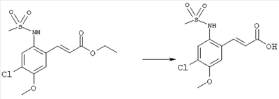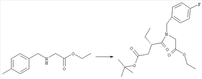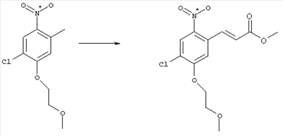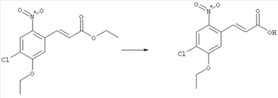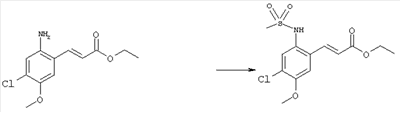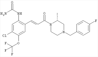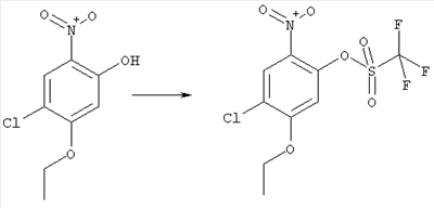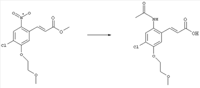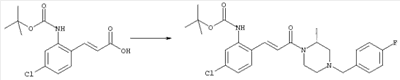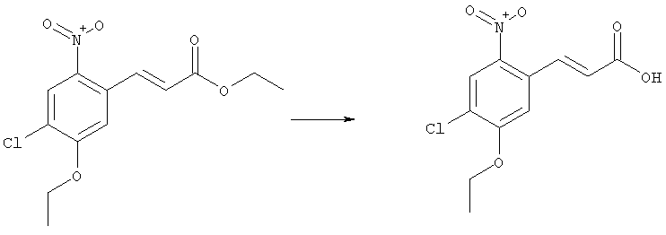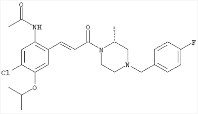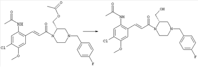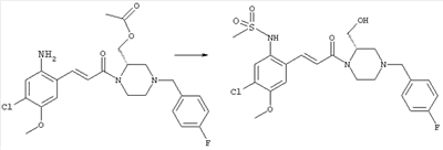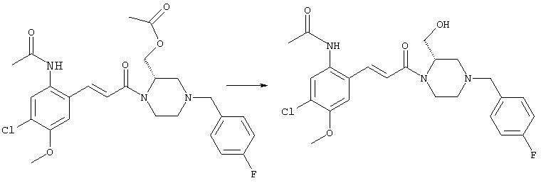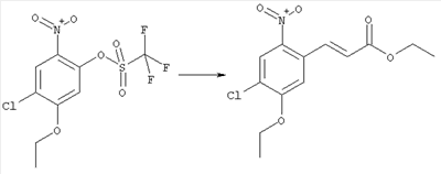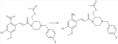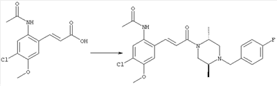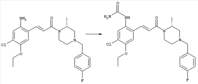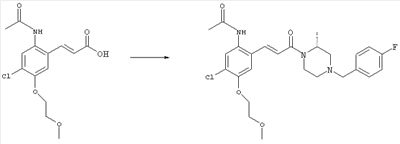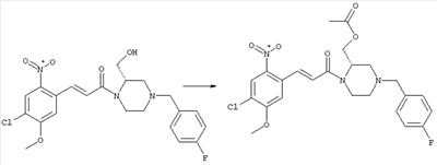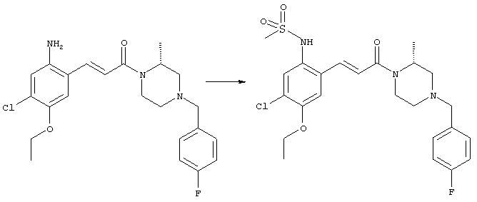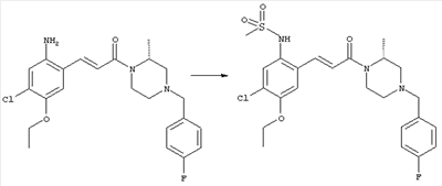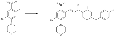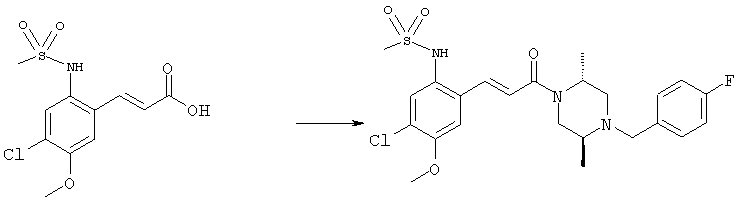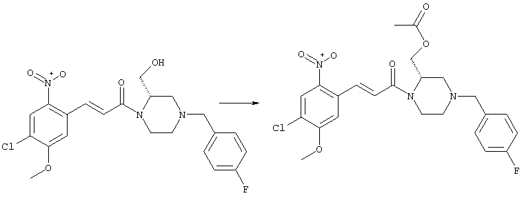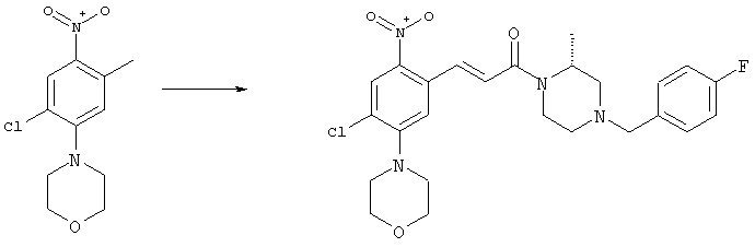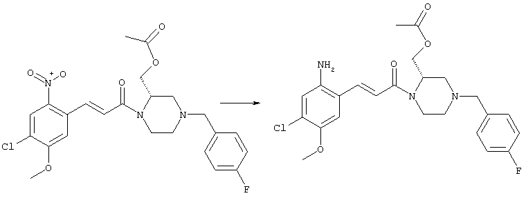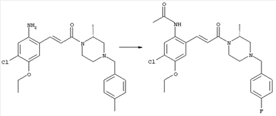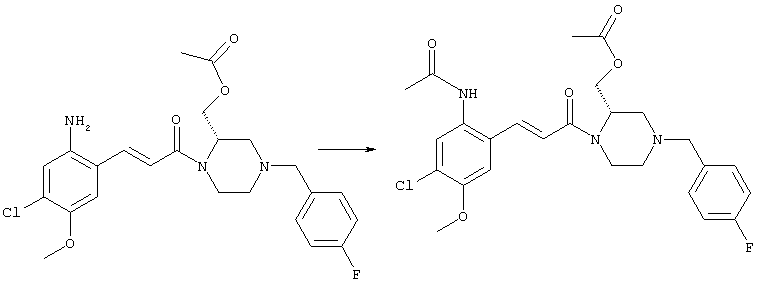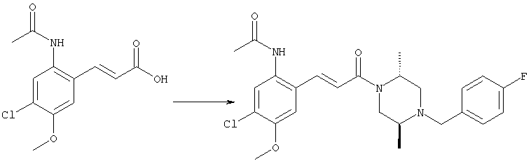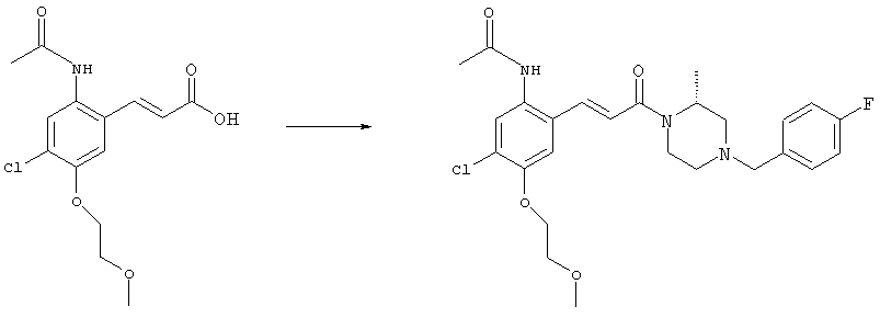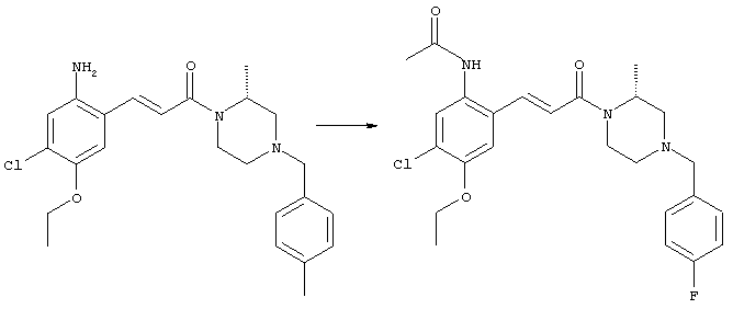 3-Метоксифенол (14,9 г, 120,0 ммоля) растворяли в 60 мл хлороформа. Затем в течение 1 ч при 0°С по каплям добавляли 17,12 г (126,0 ммоля) сульфурилхлорида и перемешивали при 0°С в течение 2 ч, затем добавляли 100 мл воды и 50 мл ДХМ. Органический слой отделяли, промывали водой и насыщенным раствором хлорида натрия. Указанное в заголовке соединение очищали хроматографией (SiO2, элюент: этилацетат/циклогексан, 2:8), при этом получали продукт в виде жидкости желтого цвета (7,50 г, 39%). 1H-ЯМР (400 МГц, ДМСО-d6): 1,37 (t, 3Н), 4,02 (qa, 2H), 6,30 (dd, 1H), 6,48 (d, 1H), 7,15 (d, 1H), 9,70 (ушир. s, 1OН). МС (EI) m/z: 172 (М+, 100). б) 4-Хлор-5-этокси-2-нитрофенол Соединение, полученное на стадии а) (15,8 г, 91,5 ммоля), растворяли в 180 мл хлороформа, затем при 0°С по каплям добавляли 3,8 мл (91,5 ммоля) 100% дымящей азотной кислоты и перемешивали в течение 20 мин при 0°С, затем добавляли 100 мл ДХМ. Органический слой промывали 2 раза водой и 1 раз насыщенным раствором хлорида натрия. Указанное в заголовке соединение очищали хроматографией (SiO2, элюент: этилацетат/циклогексан, 2:8), при этом получали твердое вещество желтого цвета (10,17 г, 51%). 1H-ЯМР (400 МГц, ДМСО-d6): 1,36 (t, 3H), 4,17 (qa, 2H), 6,75 (s, 1H), 8,03 (s, 1H), 11,05 (ушир. s, 1OН). MC (EI) m/z: 217 (M+, 100). в) 4-Хлор-5-этокси-2-нитрофениловый эфир трифторметансульфоновой кислоты Соединение, полученное на стадии б) (10,2 г, 46,8 ммоля), растворяли в 250 мл ДХМ и добавляли 7,71 мл (56,2 ммоля) NEt3. Затем при 0°С по каплям добавляли 5,44 мл (51,5 ммоля) хлорангидрида трифторметансульфоновой кислоты и перемешивали при 0°С в течение 90 мин. Полученный раствор промывали 2 раза водой и 1 раз насыщенным раствором хлорида натрия. Указанное в заголовке соединение очищали хроматографией (SiO2, элюент: этилацетат/циклогексан, 2:8), при этом получали масло желтого цвета (15,98 г, 97%). 1Н-ЯМР (400 МГц, ДМСО-d6): 1,40 (t, 3H), 4,35 (qa, 2H), 7,48 (s, 1H), 8,50 (s, 1H). MC (EI) m/z: 349 (M+, 100). г) Этиловый эфир (Е)-3-(4-хлор-5-этокси-2-нитрофенил)акриловой кислоты Соединение, полученное на стадии в) (3,0 г, 8,58 ммоля), и 4,0 г (10,3 ммоля) этилового эфира (Е)-3-трибутилциннанилакриловой кислоты растворяли в 75 мл ДМФА и добавляли 120 мг дихлорида бис(трифенилфосфин)палладия (II). Полученную смесь перемешивали при 140°С в течение 20 мин и упаривали. Указанное в заголовке соединение очищали хроматографией (SiO2, элюент: этилацетат/циклогексан, 2:8), при этом получали твердое вещество грязно-белого цвета (1,53 г, 59%). 1H-ЯМР (400 МГц, ДМСО-d6): 1,27 (t, 3Н), 1,38 (t, 3Н), 4,20 (qa, 2H), 4,35 (qa, 2H), 6,75 (d, 1H), 7,45 (s, 1H), 7,95 (d, 1H), 8,22 (s, 1H). MC (ES+) m/z: 322,1 (MNa+, 100). д) (Е)-3-(4-Хлор-5-этокси-2-нитрофенил)акриловая кислота Соединение, полученное на стадии г) (1,40 г, 4,77 ммоля), растворяли в 50 мл EtOH и добавляли 2,1 мл 2н. NaOH, полученную смесь нагревали при 95°С в течение 20 мин. Раствор охлаждали до комнатной температуры и подкисляли добавлением 2н. HCl до рН 1. Полученное твердое вещество промывали EtOH, водой, диэтиловым эфиром и сушили в течение 8 ч при 60°С, при этом получали указанное в заголовке соединение в виде твердого вещества грязно-белого цвета (1,1 г, 84%). 1Н-ЯМР (400 МГц, ДМСО-d6): 1,40 (t, 3Н), 4,35 (qa, 2Н), 6,62 (d, 1H), 7,45 (s, 1H), 7,87 (d, 1H), 8,20 (s, 1H), 12,80 (ушир. s, 1OН). MC (ES–) m/z: 270 (M-H–, 45), 197(75), 169(100). е) N-(5-Хлор-4-этокси-2-{(Е)-3-[(R)-4-(4-фторбензил)-2-метилпиперазин-1-ил]-3-оксопропенил}фенил)ацетамид (Е)-3-(2-Амино-4-хлор-5-этоксифенил)-1-[(R)-4-(4-фторбензил)-2-метилпиперазин-1-ил]пропенон (полученный при конденсации и восстановлении амида, с использованием SnCl2, как описано в примере 30) (0,1 г, 0,23 ммоля) растворяли в 10 мл ТГФ, затем добавляли 38,7 мкл (0,28 ммоля) Net3 и 16,5 мкл (0,23 