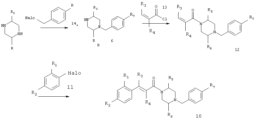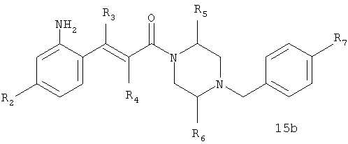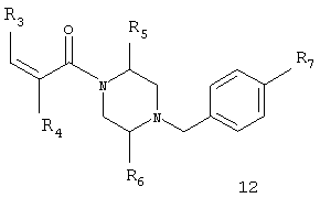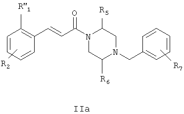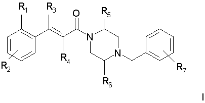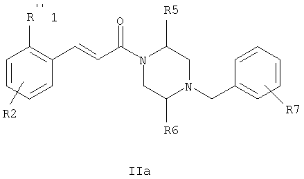 в котором R”1 означает -NR”11R”12, где -NR”11R”12 в общем случае означает имидазолидинил-2,4-дион, необязательно замещенный одной или двумя (низш.)алкильными группами, R2, R5, R6 и R7 определены в п.1. 6. Соединение формулы I по п.1, выбранное из группы, включающей N-(5-хлор-2-[(Е)-3-[(R)-4-(4-фторбензил)-2-метилпиперазин-1-ил]-3-оксопропенил]фенил)-N’-цианогуанидин, N-(5-хлор-2-[(Е)-3-[(R)-4-(4-фторбензил)-2-метилпиперазин-1-ил]-3-оксопропенил]фенил)ацетамид, N-(5-хлор-2-[(Е)-3-[(S)-4-(4-фторбензил)-2-метилпиперазин-1-ил]-3-оксопропенил]фенил)ацетамид, (5-хлор-2-[(Е)-3-[(R)-4-(4-фторбензил)-2-метилпиперазин-1-ил]-3-оксопропенил]фенил)мочевину, (5-хлор-2-[(Е)-3-[(S)-4-(4-фторбензил)-2-метилпиперазин-1-ил]-3-оксопропенил]фенил)мочевину, N-(5-хлор-2-[(Е)-3-[(R)-4-(4-фторбензил)-2-метилпиперазин-1-ил]-3-оксопропенил]фенил)-N,N-диметилсульфамид, N-(5-хлор-2-[(Е)-3-[(R)-4-(4-фторбензил)-2-метилпиперазин-1-ил]-3-оксопропенил]фенил)метансульфонамид, (5-хлор-2-{(Е)-3-[(R)-4-(4-фторбензил)-2-метилпиперазин-1-ил]-3-оксопропенил}фенил)амид 1-ацетилпиперидин-4-карбоновой кислоты, (5-хлор-2-[(Е)-3-[(R)-4-(4-фторбензил)-2-метилпиперазин-1-ил]-3-оксопропенил]фенил)амид 1-метил-1Н-имидазол-4-сульфоновой кислоты, N-[5-(5-хлор-2-[(Е)-3-[(R)-4-(4-фторбензил)-2-метилпиперазин-1-ил]-3-оксопропенил]фенилсульфамоил)тиазол-2-ил]ацетамид, (5-хлор-2-[(Е)-3-[(R)-4-(4-фторбензил)-2-метилпиперазин-1-ил]-3-оксопропенил]фенил)амид 2-оксоимидазолидин-1-карбоновой кислоты, N-(4-хлор-2-[(Е)-3-[4-(4-фторбензил)-2-метилпиперазин-1-ил]-3-оксопропенил]фенил)метилтио-N’-цианотиомочевина, N-(4-хлор-2-[(Е)-3-[4-(4-фторбензил)-2-метилпиперазин-1-ил]-3-оксопропенил]фенил)сульфонилмочевина, (5-хлор-2-[(Е)-3-[(2R,5S)-4-(4-фторбензил)-2,5-диметилпиперазин-1-ил]-3-оксопропенил]фенил)мочевина, N-(5-хлор-2-[(Е)-3-[(2R,5S)-4-(4-фторбензил)-2,5-диметилпиперазин-1-ил]-3-оксопропенил]фенил)ацетамид, N-(5-хлор-2-[(E)-3-[(2S,5R)-4-(4-фторбензил)-2,5-диметилпиперазин-1-ил]-3-оксопропенил]фенил)ацетамид, (5-хлор-2-[(Е)-3-[(2S,5R)-4-(4-фторбензил)-2,5-диметилпиперазин-1-ил]-3-оксопропенил]фенил)мочевина, N-(5-хлор-2-[(Е)-3-[4-(4-фторбензил)пиперазин-1-ил]-3-оксопропенил]фенил)ацетамид, (5-хлор-2-[(Е)-3-[4-(4-фторбензил)пиперазин-1-ил]-3-оксопропенил]фенил)мочевина, (Е)-3-[4-хлор-2-(4-гидрокси-1-метилпиперидин-4-илэтинил)фенил]-1-[(R)-4-(4-фторбензил)-2-метилпиперазин-1-ил]пропенон, (Е)-3-[4-хлор-2-(4-гидрокси-1-метилпиперидин-4-илэтинил)фенил]-1-[(S)-4-(4-фторбензил)-2-метилпиперазин-1-ил]пропенон, (Е)-3-[4-хлор-2-[(Е)-2-(4-гидрокси-1-метилпиперидин-4-ил)винил]фенил]-1-[(R)-4-(4-фторбензил)-2-метилпиперазин-1-ил]пропенон, (Е)-3-[4-хлор-2-[(Е)-2-(4-гидрокси-1-метилпиперидин-4-ил)винил]фенил]-1-[(S)-4-(4-фторбензил)-2-метилпиперазин-1-ил]пропенон, трет-бутиловый эфир 4-(5-хлор-2-[(Е)-3-[(R)-4-(4-фторбензил)-2-метилпиперазин-1-ил]-3-оксопропенил]фенилэтинил)-4-гидроксипиперидин-1-карбоновой кислоты, (Е)-3-[4-хлор-2-(4-гидроксипиперидин-4-илэтинил)фенил]-1-[(R)-4-(4-фторбензил)-2-метилпиперазин-1-ил]пропенон, (Е)-3-[2-(3-амино-3-метилбут-1-инил-4-хлорфенил]-1-[(R)-4-(4-фторбензил)-2-метилпиперазин-1-ил]пропенон, (Е)-3-[4-хлор-2-(3-диметиламинопроп-1-инил)фенил]-1-[4-(4-фторбензил)-2-метилпиперазин-1-ил]пропенон, (Е)-3-[4-хлор-2-(3-гидрокси-3-метилбут-1-инил)фенил]-1-[4-(4-фторбензил)-2-метилпиперазин-1-ил]пропенон, N-(3-[(Е)-3-[(R)-4-(4-фторбензил)-2-метилпиперазин-1-ил]-3-оксопропенил]нафтален-2-ил)ацетамид, (3-[(Е)-3-[(R)-4-(4-фторбензил)-2-метилпиперазин-1-ил]-3-оксопропенил]нафтален-2-ил)мочевина, N-(3-[(Е)-3-[(R)-4-(4-фторбензил)-2-метилпиперазин-1-ил]-3-оксопропенил]нафтален-2-ил)-N’-цианогуанидин, N-(4-хлор-2-[(Е)-3-[4-(4-фторбензил)-2-метилпиперазин-1-ил]-3-оксопропенил]фенил)-N’-цианогуан