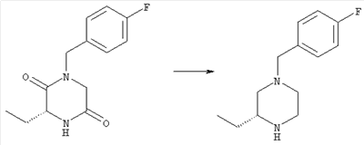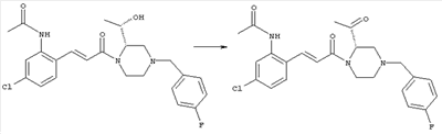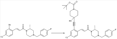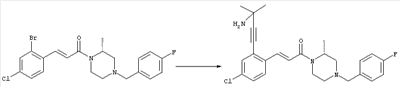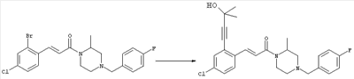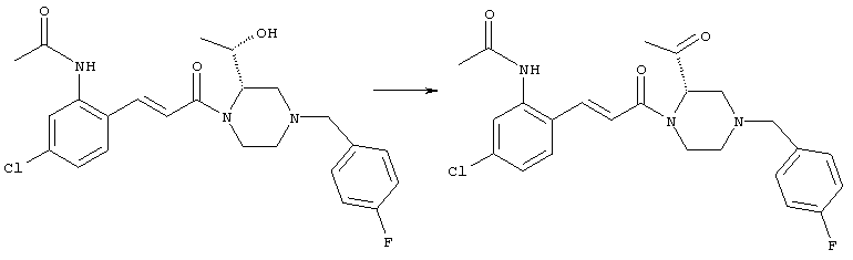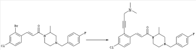 1H-ЯМР (400 МГц, ДМСО-d6): 1,98 (s, 3H), 2,35-2,41 (m, 2H), 2,43-2,48 (m, 2H), 3,40-3,49 (m, 4H), 3,55 (s, 2H), 7,30 (d, 1H), 7,53 (s, 1H), 7,64 (d, 1H). MC (ESI+): 331 [M+H]+. б) (Е)-3-[2-(4-Ацетилпиперазин-1-илметил)-4-хлорфенил]-1-[4-(4-фторбензил)-2-метилпиперазин-1-ил]пропенон 1Н-ЯМР (400 МГц, ДМСО-d6): 1,24 (d, 3H), 1,90-2,00 (m, 1H), 1,98 (s, 3H), 2,04-2,14 (m, 1H), 2,32 (t, 2H), 2,39 (t, 2H), 2,66 (d, 1H), 2,82 (d, 1H), 3,40 (ушир. s, 4H), 3,43 и 3,52 (AB-Sys., 2H), 3,57 (s, 2H), 4,09-4,28 (m, 1H), 4,43-4,67 (m, 1H), 7,10 (d, 1H), 7,16 (t, 2H), 7,33-7,41 (m, 3H), 7,42 (s, 1H), 7,82 (d, 1H), 7,83 (d, 1H). MC (ESI+): 513 [M+H]+. Пример 72 (Е)-3-[4-Хлор-2-(4-изопропилпиперазин-1-илметил)фенил]-1-[(R)-4-(4-фторбензил)-2-метилпиперазин-1-ил]пропенон а) 1-(2-Бром-5-хлорбензил)-4-изопропилпиперазин