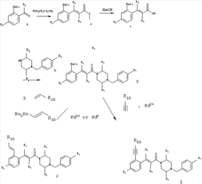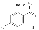 где заместители определены выше. Например, синтез проводят в присутствии пригодного катализатора, например, ацетата палладия в инертном растворителе, таком как диглим, и предпочтительно при повышенной температуре, например, при 140°С. Соединение формулы 2 получают конденсацией соединения формулы 3