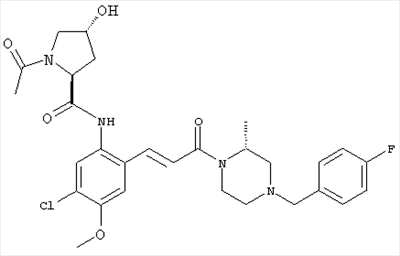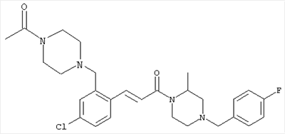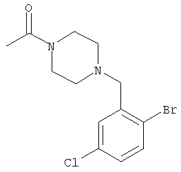 1Н-ЯМР (400 МГц, ДМСО-d6): 2,17 (s, 3Н), 2,22-2,50 (m, 8H), 3,50 (s, 2H), 7,28 (d, 1H), 7,48 (s, 1H), 7,62 (d, 1H). MC (ESI+): 303 [M+H]+. б) (Е)-3-[4-Хлор-2-(4-метилпиперазин-1-илметил)фенил]-1-[4-(4-фторбензил)-2-метилпиперазин-1-ил]пропенон 1H-ЯМР (400 МГц, ДМСО-d6): 1,25 (d, 3H), 1,88-2,00 (m, 1H), 2,04-2,17 (m, 1H), 2,20-2,46 (m, 9H), 2,66 (d, 1H), 2,82 (d, 1H), 3,43 и 3,52 (AB-Sys; 2H), 3,52 (s, 2H), 4,10-4,28 (m, 1H), 4,45-4,65 (m, 1H), 7,08 (d, 1H), 7,16 (t, 2H), 7,33-7,40 (m, 4H), 7,29 (d, 1H), 7,30 (d, 1H). MC (ESI+): 485 [М+Н]+. Пример 71 (Е)-3-[2-(4-Ацетилпиперазин-1-илметил)-4-хлорфенил]-1-[4-(4-фторбензил)-2-метилпиперазин-1-ил]пропенон а) 1-[4-(2-Бром-5-хлорбензил)пиперазин-1-ил]этанон