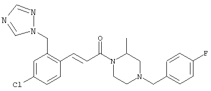 1H-ЯМР (400 МГц, ДМСО-d6): 5,50 (s, 2Н), 7,21 (d, 1Н), 7,39 (dd, 1H), 7,70 (d, 1H), 8,04 (s, 1H), 8,68 (s, 1H). MC (ESI+): 272 [M+H]+. б) (Е)-3-(4-Хлор-2-[1,2,4]триазол-1-илметилфенил)-1-[4-(4-фторбензил)-2-метилпиперазин-1-ил]пропенон 1H-ЯМР (400 МГц, ДМСО-d6): 1,24 (d, 3Н), 1,87-2,16 (m, 2Н), 2,66 (d, 1H), 2,82 (d, 1H), 2,88-3,05 (m, 1H), 3,42 и 3,53 (AB-Sys., 2Н), 4,02-4,68 (m, 2Н), 5,59 (s, 2Н), 7,12 (d, 1H), 7,17 (t, 2Н), 7,28 (d, 1H), 7,36 (dd, 2Н), 7,45 (dd, 1H), 7,70 (d, 1H), 7,87 (d, 1H), 7,98 (s, 1H), 8,59 (s, 1H). MC (ESI+): 454 [M+H]+. Пример 70 (Е)-3-[4-Хлор-2-(4-метилпиперазин-1-илметил)фенил]-1-[4-(4-фторбензил)-2-метилпиперазин-1-ил]пропенон а) 1-(2-Бром-5-хлорбензил)-4-метилпиперазин