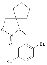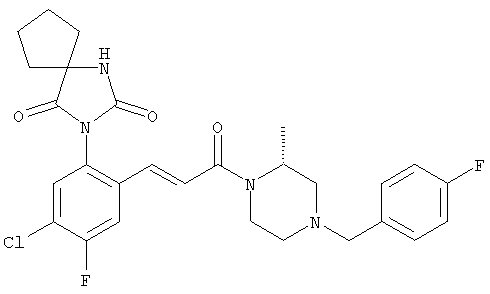 1Н-ЯМР (400 МГц, ДМСО-d6): 1,48-1,76 (m, 8H), 3,68 (s, 2H), 5,18 (s, 2H), 7,37 (dd, 1H), 7,68 (d, 1H), 7,72 (d, 1H), 7,81 (s, 1H). MC (EI) m/z: 263 [N-Br]+. б) 1-(5-Хлор-2-{(Е)-3-[(R)-4-(4-фторбензил)-2-метилпиперазин-1-ил]-3-оксопропенил} бензил]-3-окса-1-азаспиро[4,4]нонан-2-он 1H-ЯМР (400 МГц, ДМСО-d6): 1,18-1,33 (m, 5Н), 1,43-1,79 (m, 6H), 1,84-2,18 (m, 2H), 2,66 (d, 1H), 2,78-3,05 (m, 2H), 3,42 и 3,51 (AB-Sys., 2H), 4,02-4,68 (m, 2H), 4,21 (s, 2H), 4,43 (s, 2H), 7,10 (d, 1H), 7,14 (t, 2H), 7,27 (d, 1H), 7,23-7,39 (m, 3Н), 7,70 (d, 1H), 7,78 (d, 1H). MC (ESI+) m/z: 526 [М+Н]+. Пример 74 3-(5-Хлор-2-{(Е)-3-[(R)-4-(4-фторбензил)-2-метилпиперазин-1-ил]-3-оксопропенил}бензил)-5,5-диметилимидазолидин-2,4-дион а) 3-(2-Бром-5-хлорбензил)-5,5-диметилимидазолидин-2,4-дион