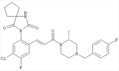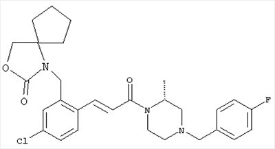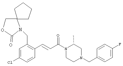 1Н-ЯМР (400 МГц, ДМСО-d6): 0,97 (d, 6H), 2,38-2,50 (m, 8H), 2,62 (септет, 1Н), 3,49 (s, 2H), 7,27 (dd, 1H), 7,47 (d, 1H), 7,60 (d, 1H). MC (ESI+): 331 [M+H]+. б) (Е)-3-[4-Хлор-2-(4-изопропилпиперазин-1-илметил)фенил]-1-[(R)-4-(4-фторбензил)-2-метилпиперазин-1-ил]пропенон 1Н-ЯМР (400 МГц, ДМСО-d6): 0,94 (d, 6H), 1,24 (ушир. s, 3Н), 1,88-2,15 (m, 2H), 2,28-2,46 (m, 8H), 2,59 (септет, 1H), 2,66 (d, 1H), 2,78-2,86 (m, 1H), 3,35-3,55 (m, 3Н), 3,49 (s, 2H), 4,06-. MC (ESI+): 513 [M+H]+. Пример 73 1-(5-Хлор-2-{(Е)-3-[(R)-4-(4-фторбензил)-2-метилпиперазин-1-ил]-3-оксопропенил) бензил-3-окса-1-азаспиро[4,4]нонан-2-он а) 1-(2-Бром-5-хлорбензил)-3-окса-1-азаспиро[4,4]нонан-2-он