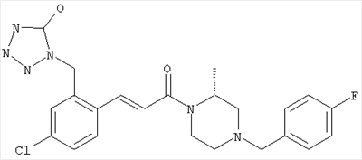 1Н-ЯМР (400 МГц, ДМСО-d6): 2,59 (s, 3Н), 5,61 (s, 2H), 7,39 (d, 1H), 7,43 (dd, 1H), 7,72 (d, 1H). MC (ESI+) m/z: 287 [M+H]+. б) (Е)-3-[4-Хлор-2-(5-метилтетразол-1-илметил)фенил]-1-[(R)-4-(4-фторбензил)-2-метилпиперазин-1-ил]пропенон 1Н-ЯМР (400 МГц, ДМСО-d6): 1,22 (ушир. s, 3Н), 1,84-2,18 (m, 2H), 2,58 (s, 3Н), 2,64 (d, 1H), 2,81 (d, 1H), 2,86-3,05 (m, 1H), 3,37-3,56 (m, 2H), 3,96-4,18 (m, 2H), 5,74 (s, 2H), 7,10 (d, 1H), 7,15 (t, 2H), 7,29 (d, 1H), 7,35 (dd, 2H), 7,49 (dd, 1H), 7,67 (d, 1H), 7,88 (d, 1H). MC (ESI+) m/z: 469 [M+H]+. Пример 77 5-Хлор-2-{(Е)-3-[(R)-4-(4-фторбензил)-2-метилпиперазин-1-ил]-3-оксопропенил}-N-метокси-N-метилбензамид а) 2-Бром-5-хлор-N-метокси-N-метилбензамид