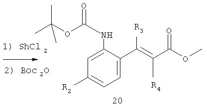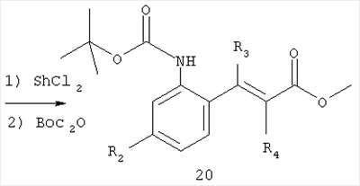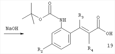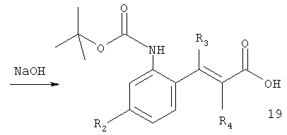 например, в присутствии гидроксида натрия в пригодном растворителе, таком как метанол, предпочтительно при повышенной температуре, например, 50°С. Соединение формулы 20 получают при восстановлении соединения формулы 21 с последующей обработкой реагентом Вос2О