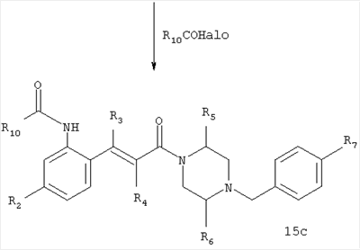 Соединение формулы 15с получают конденсацией соединения формулы 15b с пригодным соединением, например, карбоновой кислотой или активированной карбоновой кислотой, например, R10COCl или R10COOH, в присутствии пригодного конденсирующего агента, например, NH2 или гидрохлорида EDCl, предпочтительно в инертном растворителе, таком как дихлорметан. Соединение формулы 15b получают при удалении аминозащитной группы в соединении формулы 15а например, в кислотных условиях, например, в присутствии HCl. Содинение формулы 15а получают конденсацией соединения формулы 19