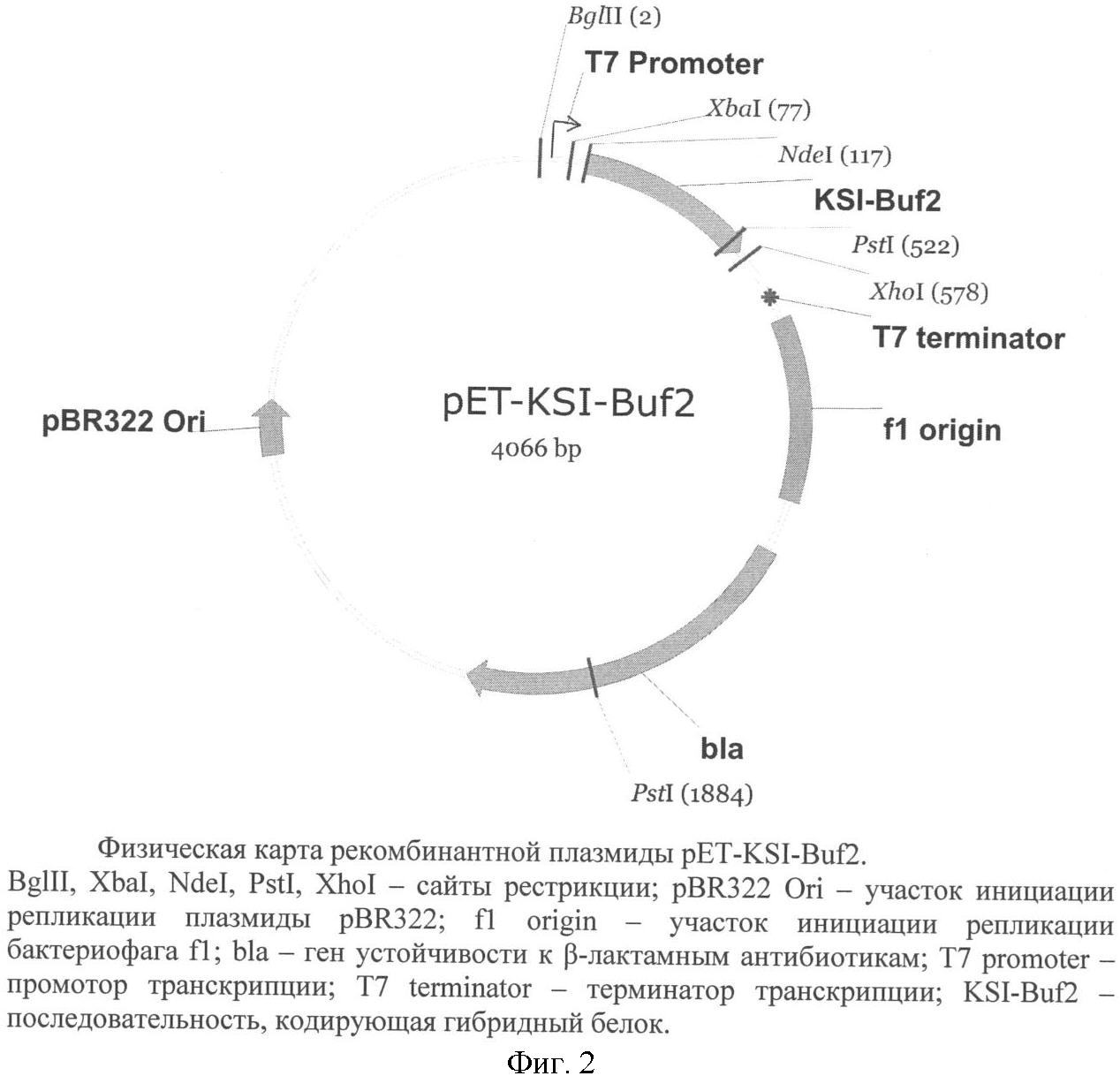 Нуклеотидную последовательность, содержащую промотор транскрипции Т7-РНК-полимеразы, участок связывания рибосомы и участок, кодирующий гибридный полипептид KSI-Buf2, получают химико-ферментативным синтезом. Химический синтез олигонуклеотидов, используемых для сборки нуклеотидной последовательности, выполняют твердофазным фосфоамидитным методом с наращиванием олигонуклеотидной цепи в направлении от 3′-конца к 5′-концу с помощью защищенных фосфамидитов – 5′-диметокситритил-N-ацил-2′-дезоксинуклеозид-3′-O-( -цианэтилдиизопропиламино)-фосфитов, активированных тетразолом. Фрагмент, кодирующий белок-носитель KSI, получают методом ПЦР-амплификации с помощью ген-специфических праймеров, используя в качестве исходной матрицы ген KSI в плазмиде рЕТ-31b(+). Остальные участки последовательности получают путем последовательного отжига и элонгации взаимно перекрывающихся олигонуклеотидов. На завершающей стадии синтеза последовательность амплифицируют с помощью праймеров, несущих на 5′-концах сайты узнавания рестриктаз Bg1II и XhoI. Продукт амплификации гидролизуют указанными рестриктазами, очищают электрофорезом в 1,5% агарозном геле, полосу ДНК величиной 576 п.о. выделяют из геля методом электроэлюции в 15% раствор ПЭГ-6000 и лигируют с фрагментом ДНК размером 3,5 тыс. п.о., полученным в результате обработки плазмиды рЕТ20b(+) рестриктазами Bg1II и XhoI. В результате лигазной реакции образуется кольцевая ковалентно замкнутая ДНК размером 4066 п.о. Продуктами лигазной реакции трансформируют компетентные клетки E.coli DH-10B, приготовленные по стандартному протоколу с помощью 0,1 М хлорида кальция. После трансформации суспензию бактерий смешивают с питательной средой LB, растят 1 ч при 37°С и высевают на чашки Петри с LB-агаром, содержащим 50 мкг/мл ампициллина.