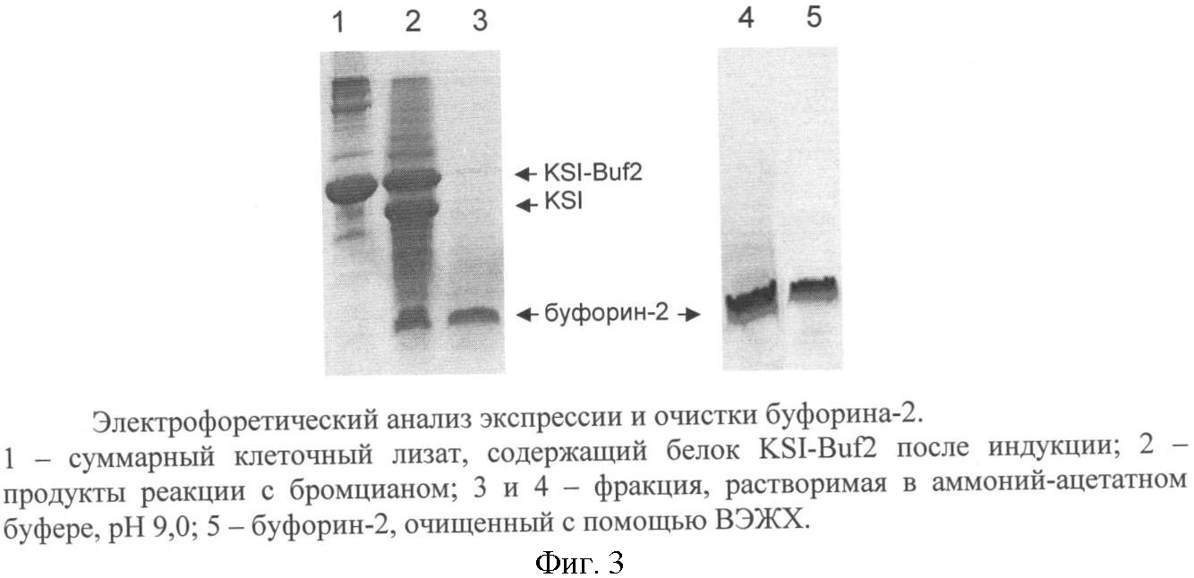 Клетки штамма BL21(DE3)/pET-KSI-Buf2 выращивают в жидкой среде LB с добавлением 150 мкг/мл ампициллина и 1% глюкозы до достижения культурой оптической плотности OD600 1,0 при температуре 37°С. Индукцию синтеза белка проводят с помощью изопропил- -D-галактозида в концентрации 1,0 мМ, после чего инкубируют 10 часов при температуре 37°С. Уровень экспрессии гибридного белка, а также содержание гибридного белка и целевого пептида в препарате на разных стадиях очистки определяют с помощью SDS-ПААГ в трис-трициновой буферной системе (фиг.3).