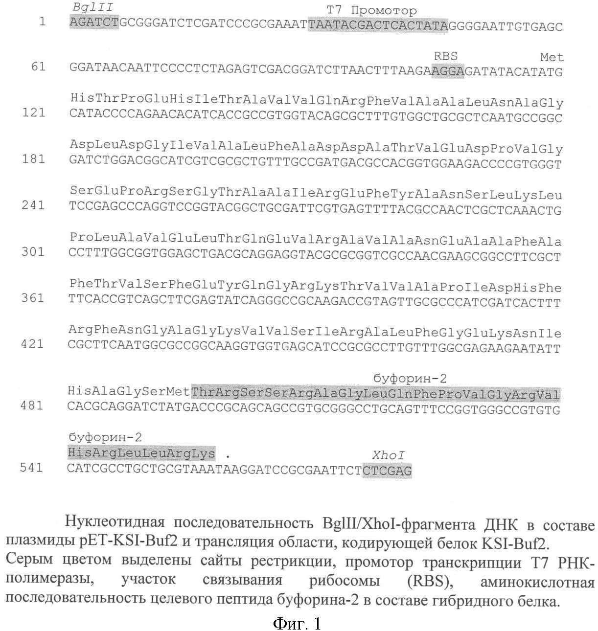 Преимущество предлагаемого изобретения заключается, во-первых, в том, что в результате осуществления способа получается пептид, полностью идентичный природному буфорину-2. На фиг.1 приведена аминокислотная последовательность гибридного белка KSI-Buf2, содержащего буфорин-2, и соответствующая ей нуклеотидная последовательность гена. Введение остатка метионина непосредственно перед N-концевым остатком буфорина-2 обеспечивает возможность избирательного химического расщепления полипептидной цепи бромцианом с высвобождением целевого пептида, не содержащего каких-либо дополнительных аминокислотных остатков по сравнению с природным буфорином-2. Использование бактериальной кетостероид-изомеразы в качестве партнера для рекомбинантной экспрессии позволяет нейтрализовать токсичность антимикробного пептида для штамма-продуцента и благодаря этому достичь высоких выходов гибридного белка (более 50% от суммарного клеточного белка). Достоинством способа является простота технологии очистки буфорина-2. Отсутствие внутренних остатков метионина в последовательности белка-носителя сводит к минимуму число индивидуальных полипептидных фрагментов, образующихся в результате реакции с бромцианом, и, таким образом, облегчает процесс очистки целевого пептида. Высокий уровень экспрессии KSI-Buf2 и его крайне низкая растворимость в воде позволяют опустить стадию хроматографической очистки гибридного белка и ограничиться отмывкой нерастворимой фракции суммарного клеточного белка. Для биосинтеза рекомбинантного белка применяются оптимальные регуляторные элементы, контролирующие его экспрессию: промотор и терминатор для высокопроцессивной РНК-полимеразы бактериофага Т7, консенсусный сайт связывания бактериальной рибосомы, стартовый и стоп-кодоны.