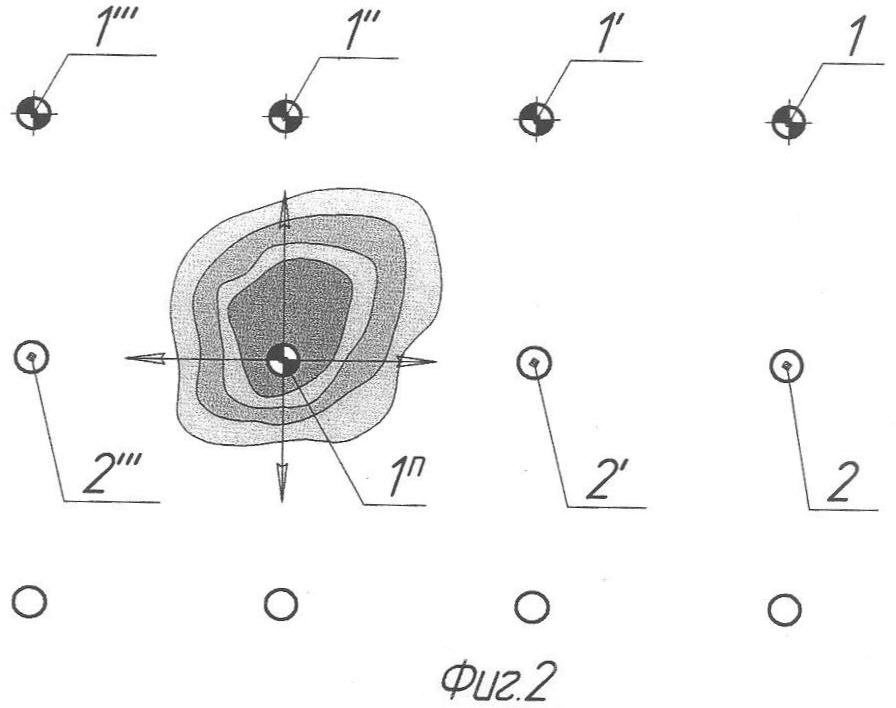 На начальной стадии разработки нефтяной залежи производят закачку рабочего агента через нагнетательные скважины 1; 1′; 1” (см. фиг.1) и отбор продукции из добывающих скважин 2; 2′; 2”. В процессе разработки залежи происходит обводнение добывающих скважин 2; 2′; 2”, причем степень обводнения каждой из добывающих скважин 2; 2′; 2” различна. Далее проводят исследования нагнетательных 1; 1′; 1” и добывающих 2; 2′; 2” скважин и определяют параметры пласта, отбирают пробы попутно добываемой воды и нефти. Затем из добывающих скважин 2; 2′; 2” отбирают наиболее обводненные добывающие скважины: например добывающая скважина 2”, а из нагнетательных скважин 1; 1′; 1” отбирают ту скважину, например нагнетательная скважина 1′, оказывающую максимальное воздействие (обводняющее) на самую обводненную добывающую скважину 2” (см. фиг.1). Останавливают эксплуатацию отобранных нагнетательной 1′ и добывающей 2” скважин. Производят в них закачку химических реагентов, причем в нагнетательную скважину – в виде последовательной закачки оторочек ПАВ – ОП-10 и СПС – водный раствор полиакриламида с ацетатом хрома, а в добывающую скважину 2” – в виде последовательной закачки оторочек указанных ПАВ, СПС, ПАВ и глинистого раствора плотностью 1100 кг/м3. После чего вновь запускают нагнетательную 1′ и добывающую 2” в эксплуатацию и продолжают разработку залежи. Если добывающая скважина 2” после указанной обработки не восстановит свою продуктивность, то ее переводят в нагнетательную 1” (см. фиг.2).