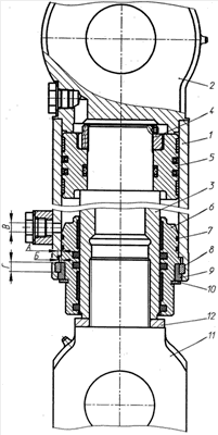 При этом уплотнительное кольцо 7 не касается кромки подводящего отверстия В. После чего в кольцевую проточку Г, выполненную в гильзе 1, устанавливают полукольца 8, надевают на головку 6 втулку 9 и фиксируют ее пружинным кольцом 10 от осевого перемещения. Затем в шток 3 вворачивают проушину 11 и стопорят ее гайкой 12.