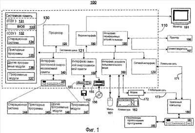 При использовании в сетевой среде ЛС компьютер 110 соединен с ЛС 171 через сетевой интерфейс или адаптер 170. При использовании в сетевой среде ГС компьютер 110 обычно включает в себя модем 172 или другое средство для установления связи через ГС 173, такую как Internet. Модем 172, который может быть внутренним или внешним, может быть соединен с системной шиной 121 через пользовательский интерфейс 160 ввода или другой подходящий механизм. В сетевой среде программные модули, изображенные относительно компьютера 110, или их части могут запоминаться в запоминающем устройстве удаленной памяти. В качестве примера, а не ограничения, фиг. 1 изображает удаленные прикладные программы 185, как находящиеся в запоминающем устройстве 181. Понятно, что изображенные сетевые соединения являются примерными, и могут использоваться любые другие средства установления линии связи между компьютерами.