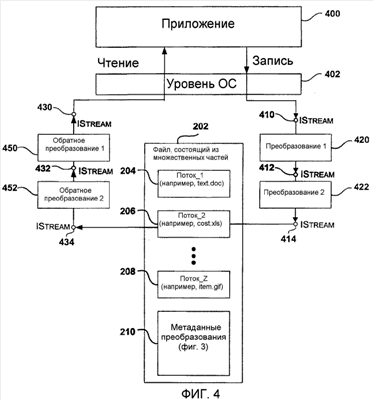 Доступ для чтения и записи осуществляется через уровень ОС. До настоящего времени операция записи предусматривала обращение к потоку 206 stream2 через интерфейс 414 IStream. Однако, согласно настоящему изобретению, перед интерфейсом 414 IStream можно вставить одно или несколько преобразований. Каждое преобразование (например, преобразование 420 и 422) берет интерфейс IStream в качестве ввода (интерфейс 410 и 412 IStream, соответственно) и выводит свои кодированные (т.е. преобразованные) данные на другой интерфейс IStream (интерфейс 412 и 414 IStream, соответственно).