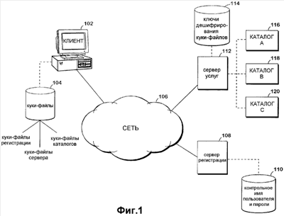 На фиг.1 изображена типичная операционная среда, в которой могут быть осуществлены варианты выполнения настоящего изобретения. Клиентский компьютер 102 соединен с сетью 106, такой как локальная вычислительная сеть, глобальная сеть или глобальный Интернет. Клиентский компьютер 102 может сообщаться с различными серверными компьютерами, также соединенными с сетью 106. Например, сервер 108 регистрации, соединенный с сетью, позволяет пользователю производить регистрацию с именем пользователя, таким как адрес электронной почты, и паролем для получения первого куки-файла сервера, который позволяет произвести аутентификацию пользователя в области сети без необходимости для пользователя снова вводить имя пользователя и пароль для этой области сети. Кроме того, сервер 108 регистрации может выдавать куки-файл регистрации пользователю клиентского компьютера, так что при попытке пользователя посетить область сети и переадресации его на сервер 108 регистрации для аутентификации принимается куки-файл регистрации для аутентификации пользователя для сервера 108 регистрации без необходимости еще одного ввода имени пользователя и пароля.